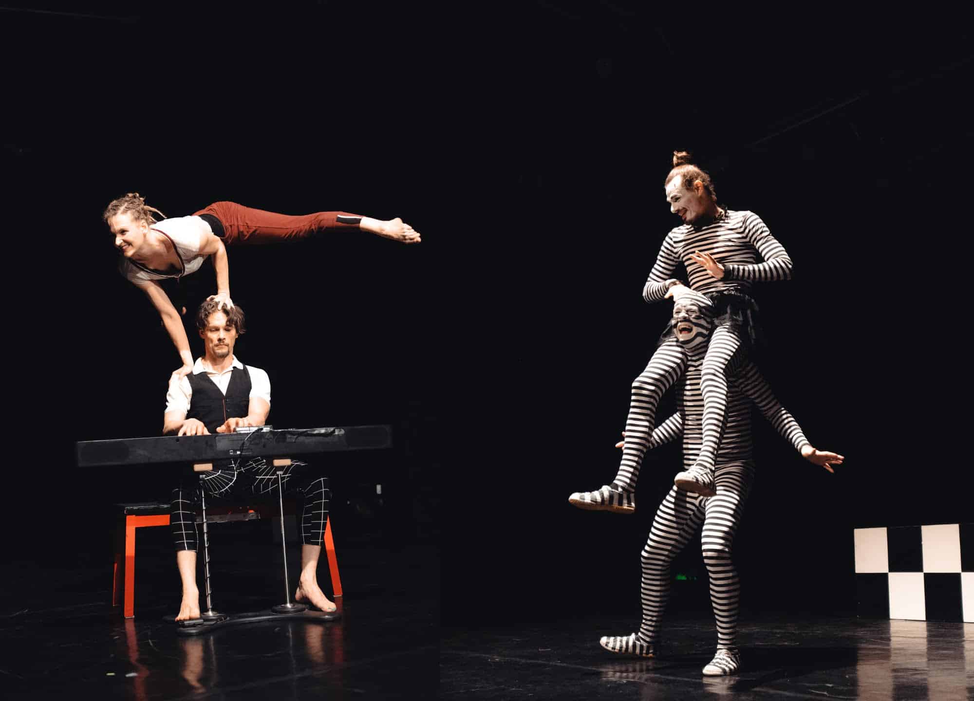 „Xpect“, akrobatisch performt von Yasmine Heyer und Uwe Sattelkow, entführt in ein gänzlich anderes Szenario. Im Mittelpunkt ihrer Show steht ein Keyboard, das sie zu Beginn umständlich über die Bühne transportieren. Die Annahme, es würde demnächst abgestellt, erweist sich rasch als falsch. Denn das Musikinstrument ist der/die/oder das Dritte im Bunde. Es wird gehoben und geschoben, es wird hochkant gestellt und auf den Schultern balanciert. Es wird umworben, wie eine Diva und – das ist das Besondere – bei all den akrobatischen Einlagen der beiden – zugleich auch noch bespielt. Sattelkow produziert zu Beginn, wie unbeabsichtigt, einzelne Töne. Doch bald schon steigert sich seine Tastenkunst zu einer Improvisation, die schließlich mit der Wiedergabe eines Einaudi-Stückes ihren Höhepunkt findet. Im Allgemeinen spielen Pianisten und Pianistinnen im Sitzen. Gelegentlich, wenn sie vom humoristischen Fach beseelt sind, fallen sie vom Hocker oder lassen den Tastendeckel auf ihre Finger fallen. Einer der Größten dieser Kunst war wohl Victor Borge. Er verstand es, Klavierspiel auf höchstem Niveau mit humorvollen Auftritten zu spicken, dass man gar nicht genug von ihm bekommen konnte. Was Sattelkow hier aber zeigt, ist etwas ganz anderes. Während Heyer auf seine Schultern steigt oder auf ihm einen Handstand vollführt, hält er sein Keyboard in Händen und spielt gleichzeitig darauf. Ganz besonders ist auch jene Szene, in welcher sich die Akrobatin so an ihm festklammert, dass nur ihre Beine links und rechts von seinem Körper zu sehen sind. Der Tanz, den diese mit den zarten Füßen vollführt, während der Pianist zugange ist, bezaubert Jung und Alt gleichermaßen. Auch lange Passagen, Kontaktimprovisationen entnommen und doch bis ins kleinste Detail durchkomponiert, sind nicht nur akrobatisch vom Feinsten, sondern zugleich auch extrem kurzweilig und unterhaltsam. Doch so anstrengend ihre Performance körperlich auch ist, immer kommt sie leichtfüßig daher. Die beiden schaffen einen Aufmerksamkeitsraum, in dem man nicht nur lacht und staunt, sondern auch den Atem anhält. Mit dem zuvor genannten Victor Borge haben sie eines gemeinsam: Man kann von ihnen nicht genug bekommen.