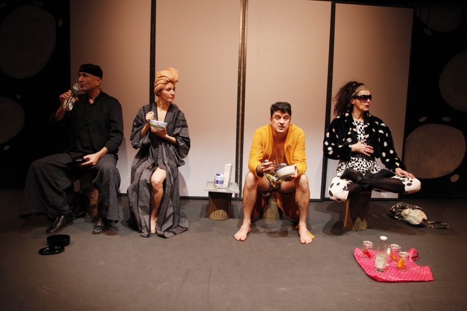 Mit viel Witz aber auch äußerst intelligenten Dialogen vergehen die 110 Minuten wie im Flug. Sandra Schüddekopf, die für die Regie verantwortlich zeichnet, lässt keine Verschnaufpausen zu. Der hohen Gag-Taktung fügt sie einen raschen Wechsel von Auf- und Abtritten hinzu, in deren Abfolge es keine einzige Minute gibt, die eine Länge aufweist. Der schwierige Theaterraum, der fast keine Tiefe aufweist, wird von ihr und Andrea Fischer, die die wunderbar schrägen Kostüme und das Bühnenbild gestaltete, optimal verwertet. Die Musik von Rupert Derschmidt pendelt zwischen deutschem Gesangsgut, Bierzeltmusik und japanischer Pentatonik bis hin zu einer Neuauflage von „Muss i denn zum Städele hinaus“, bei der sich Takeshi an einem wahnwitzig-hybriden elektronischen Instrument selbst begleitet. Seine Sicht auf Familie und Spaß kann für so manchen Liebespuristen westlicher Prägung erhellend sein. Auch wenn Janne meint, dass die Trennung von Familie auf der einen und Spaß auf der anderen Seite in unserem Kulturkreis als etwas sehr Trauriges empfunden wird.