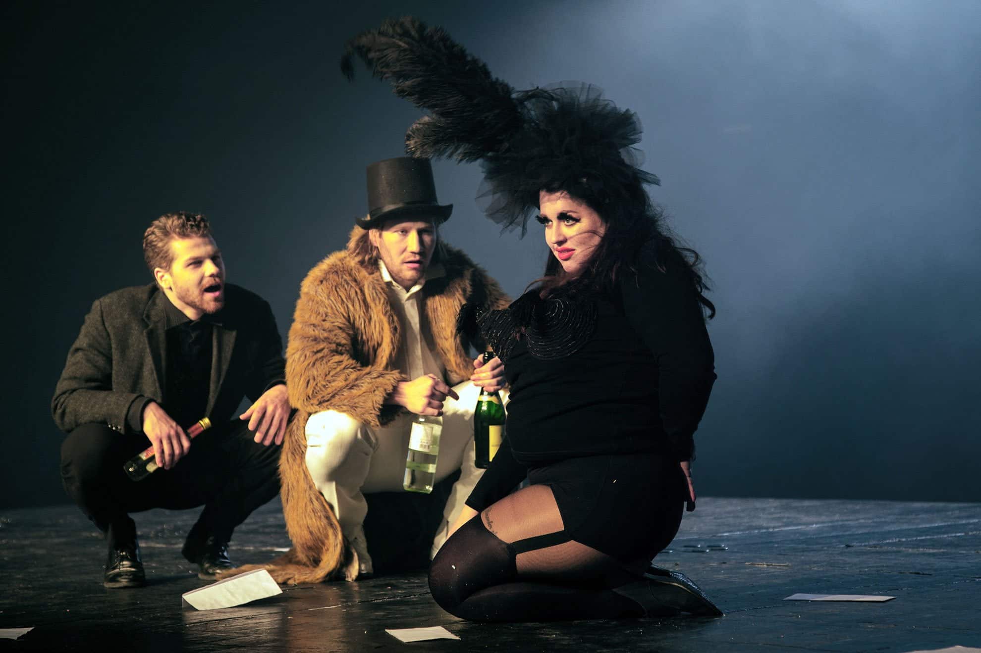 Das „Abschiedssouper“ spielt sich in einem höchst zeitgeistigen Club mit laut dröhnendem Sound ab, der zum Teil überbrüllt werden muss. Ein Kellner mit nacktem Oberkörper, engen Hosen und hohen Plateauschuhen wird gratis mitgeliefert. Bald schon stellt sich diese Szene mit Lisa-Maria-Sommerfeld in der Rolle der Annie als schauspielerischer Höhepunkt des Abends heraus. Vor sieben Jahren schloss Stefanie Reinsperger ihr Studium am Max Reinhardt Seminar ab und rutschte nahtlos in eine beinahe beispiellose Karriere. Wenn Sommerfeld auch die kommenden Rollen nur annähernd so gut spielt wie ihre Annie, dann sollte einer ähnlichen Karriere nichts im Wege stehen. Dass ihr die Regie dabei einiges abverlangt, darf sie schon einmal als unglaubliche Leistung mit auf ihren weiteren Berufsweg mitnehmen. Ihr Outfit – ein schwarzes Korsett aus dem ihre Brüste heraushängen, die Brustwarzen kreuzweise mit neon-grünem Klebeband verdeckt, schwarze Strümpfe am Strumpfgürtel fixiert und eine riesige schwarze Feder am Kopf – präsentiert sie als vulgäre, zugleich aber auch höchst sinnliche Frau, die weiß, was sie möchte und die vor allem nicht vergessen hat, dass ihr Anatol von Anbeginn ihrer Beziehung keine Treue versprach. Wie sie sich mit Spott und Hohn an ihrem Liebhaber rächt, ihm mit ganzem Körpereinsatz Sekt und Rum ins Gesicht schüttet, wie sie immer wieder vors Publikum tritt und dieses mit wenigen Gesten zu ihrem Verbündeten macht, hat große Klasse. Und auch, dass sie am Szenenende das letzte Wort hat, tut richtig gut. Anatol und Max wirken gegen sie wie kleine, blutleere Marionetten.