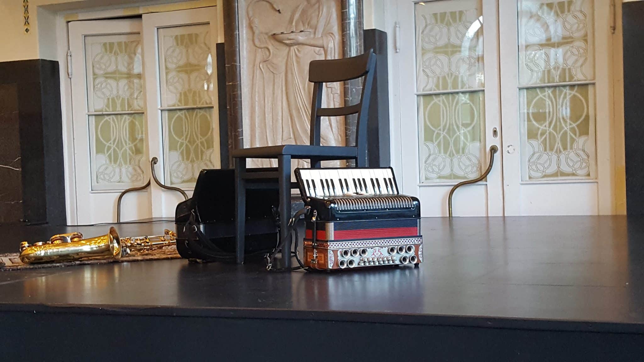 Ein kleiner Teppich mit einem darauf abgelegten Saxophon, daneben ein schwarzes, chromatisches Akkordeon und ein buntes, diatonisches. Sie bewachen zwei einfache Stühle. Einer davon verbirgt fast schamhaft eine geöffnete Weinflasche unter seinem Bauch.