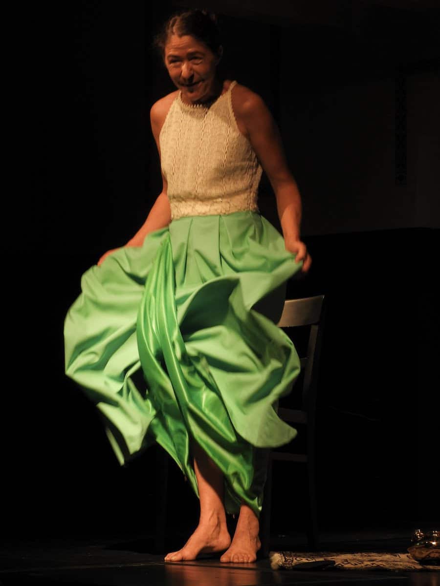 Die Augen weit offen, funkelnd, zuweilen stechend, das R, das sie rollt wie keine Zweite, bringt sich in Stellung. Der türkis-grüne, bodenlange, geraffte Rock und das weiße Spitzenoberteil werden vom lauen Sommerabend willkommen geheißen. Die Verbeugung endet am Boden vor dem glänzend polierten Saxophon. Schwer liegt die Eleganz des Akkordeons auf seinen Schenkeln, ganz im Bewusstsein der gepolsterten Tragegurte. Eine kleine, musikalische Einstimmung für das eigene Ich und das der anderen, gefolgt vom ersten Sprung ins Wörtermeer. In das Büro, in dem gearbeitet wird und in dem sich die Erzählerin völlig fremd fühlt. Ausgeschlossen von der absurden Betriebsamkeit der anderen und hinausgeworfen von der flüsternden Stimme des Chefs. Hinausgetrieben aus der Stadt, hinein in den Wald, der rund um das in die Jahre gekommene Haus in größter Selbstverständlichkeit wuchert. Da winkt er zum ersten Mal an diesem Abend herein. Herein durch die zum Teil geöffneten Fenster, in die etwas später ein leiser, kühler Lufthauch der Sommerhitze ihre schwere Decke wegziehen wird.