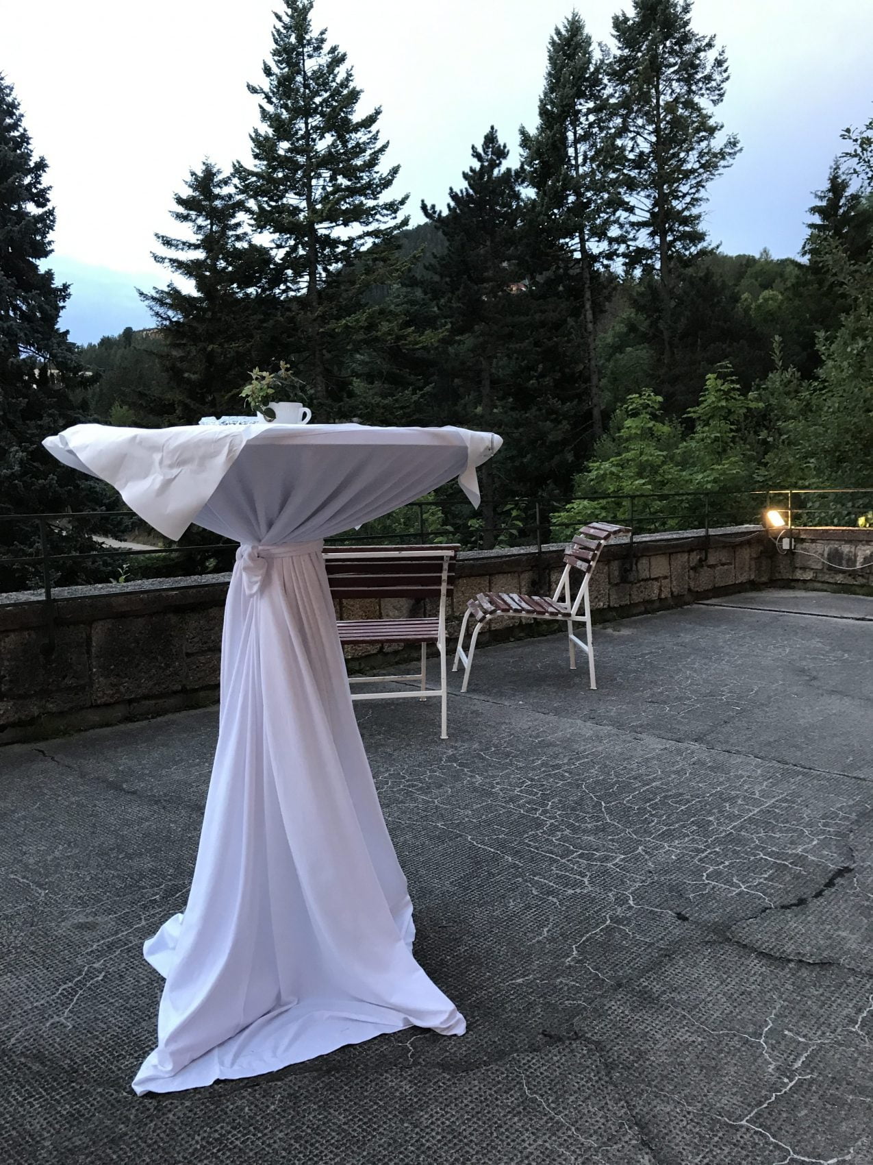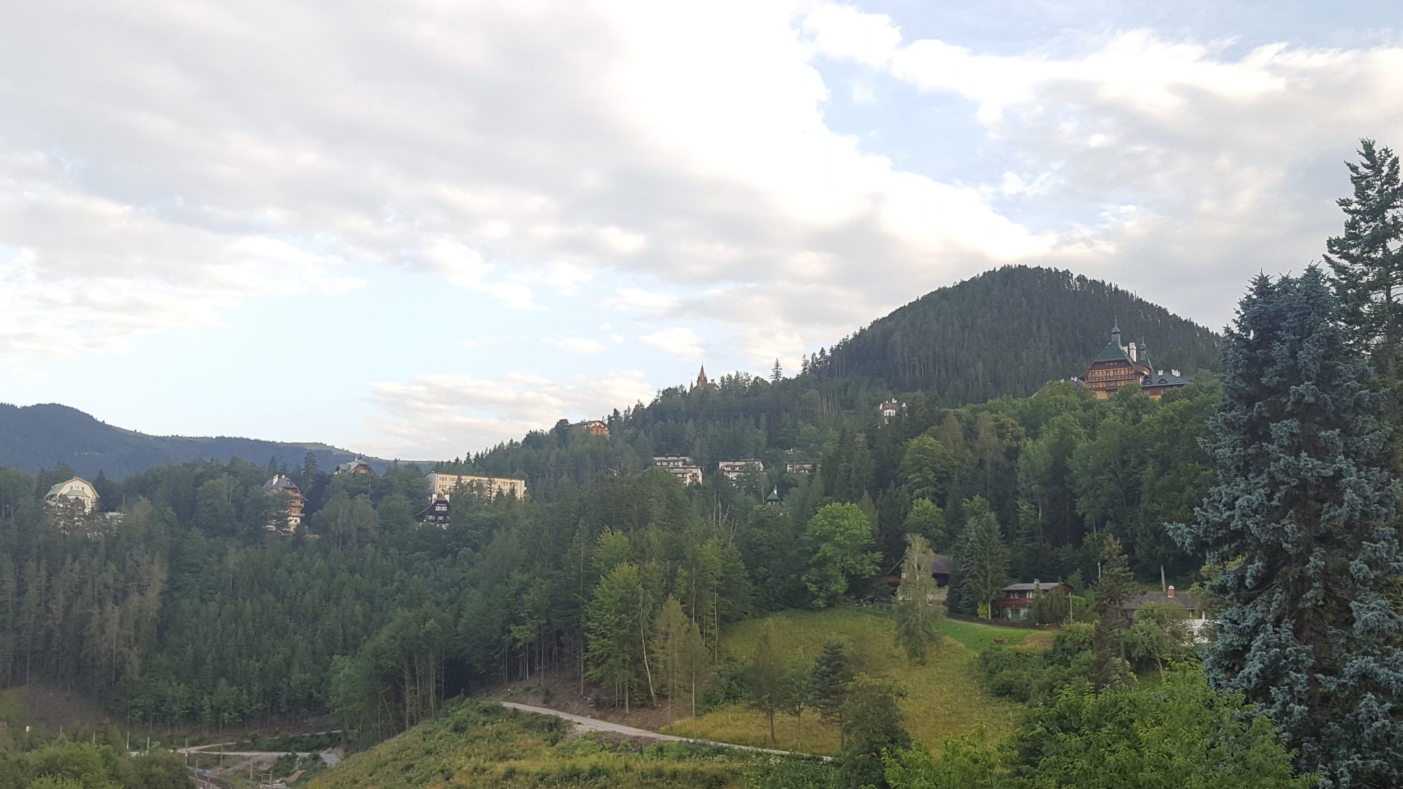 Der Boden unter den Füßen gibt leicht nach. Er ist weich und verströmt einen feinen Grasgeruch. Ein duftender Parkplatz ist eine neue Erfahrung. Der schmale Weg ins ausgeschilderte Foyer des kurhäuslichen Zauberbergimitats ist leicht abschüssig, gibt sich waldhaft und schickt Erwartungen voraus. Das verwunschene Haus mit den vielen Balkonen lebt, zumindest ein wenig. Zumindest an diesem Abend. Die Fassade ist verwaschen, die Einrichtung zusammengestoppelt, sie stammt aus besseren Zeiten. Das Berge-Gegenüber trägt vereinzelte Häuserpickel. Das Geräusch der vorbeifahrenden Züge erinnert nicht mehr an zischende Dampfmaschinen. Vielmehr rauschen sie, abhängig von der elektrischen Leine, an der sie allesamt hängen, vorbei und künden von Geschäftigkeit und Reisewillen.