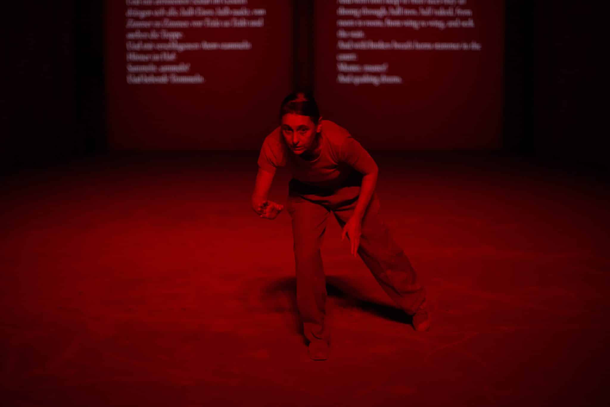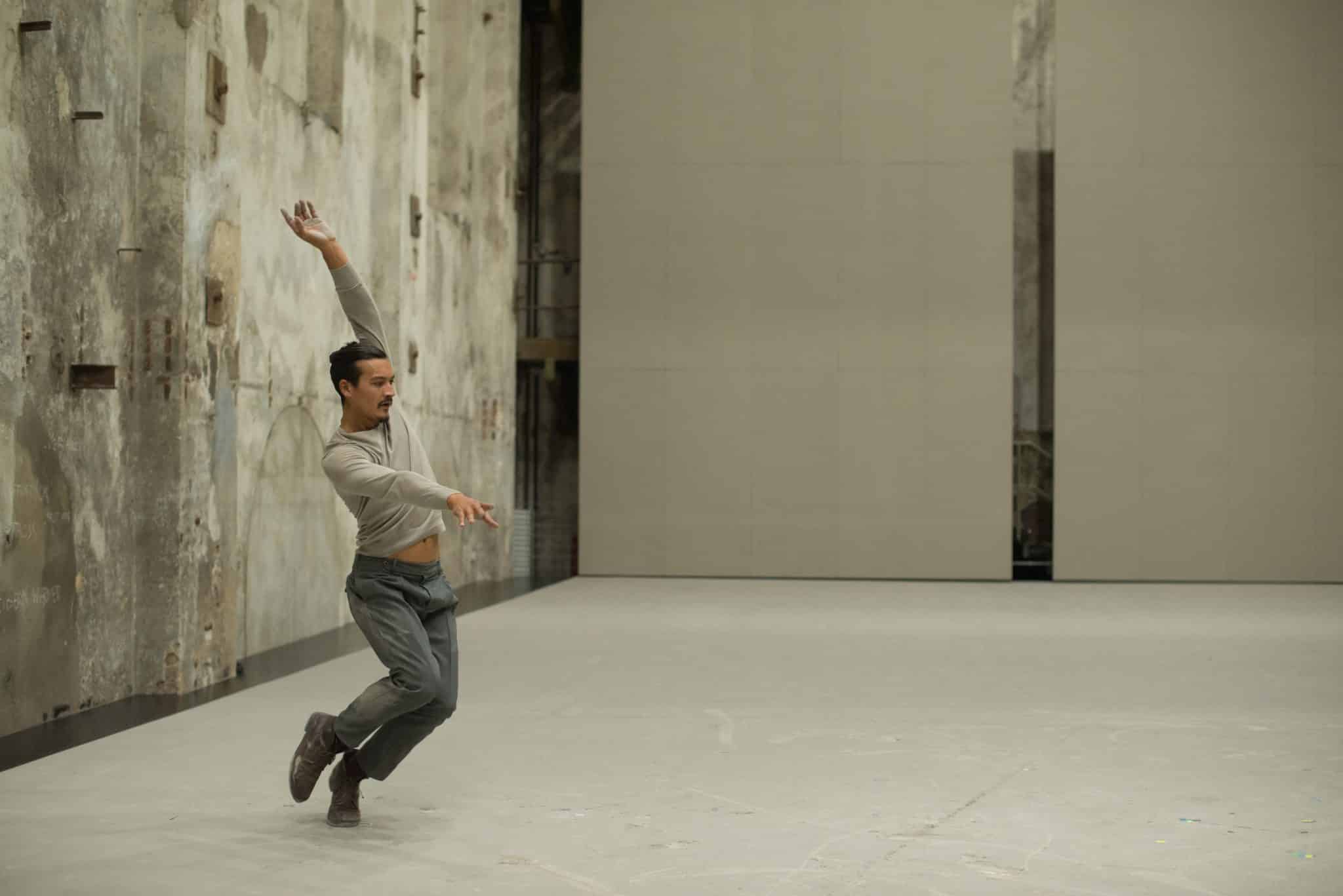 Bemerkenswert bei dieser Produktion ist nicht nur, dass Keersmaeker sie in verschiedene, in sich abgeschlossene Teile, gliedert. Bemerkenswert ist auch, dass sich Musik und Tanz, aber auch der Text selbst, lange Zeit disparat zueinander verhalten. Zu Beginn kommt Pomero alleine auf die Bühne, fängt zu tanzen an, noch während das Licht im Zuschauerraum an ist. Seine Choreografie ist geschmeidig, erinnert an vielen Stellen an das Dahingleiten mit Schlittschuhen über ein Eis. Immer wieder sind es Rumpf- und Kopfbeugungen, die sich in der Richtung abwechseln, von links nach rechts und umgekehrt. Schrittfolgen, bei denen er über den Boden rutscht lösen sich mit kurzen Läufen und vielen Drehungen ab. Es ist ein Tanzsolo ohne erkennbare Aussage, hoch rhythmisiert und extrem ästhetisch. Die geometrischen Markierungen am Boden sind kaum sichtbar und doch von Bedeutung für die Choreografie. Nachdem der junge Mann abgeht, wird der Text von Rilke zum Lesen an die Wand projiziert. Im Saal ist es dabei ganz still. Das Publikum macht nun etwas, was man für gewöhnlich in Gemeinschaft nicht tut – es liest. Leise, jeder und jede für sich nach dem individuellen Tempo, auf Deutsch oder Englisch, beide Sprachen werden angeboten.