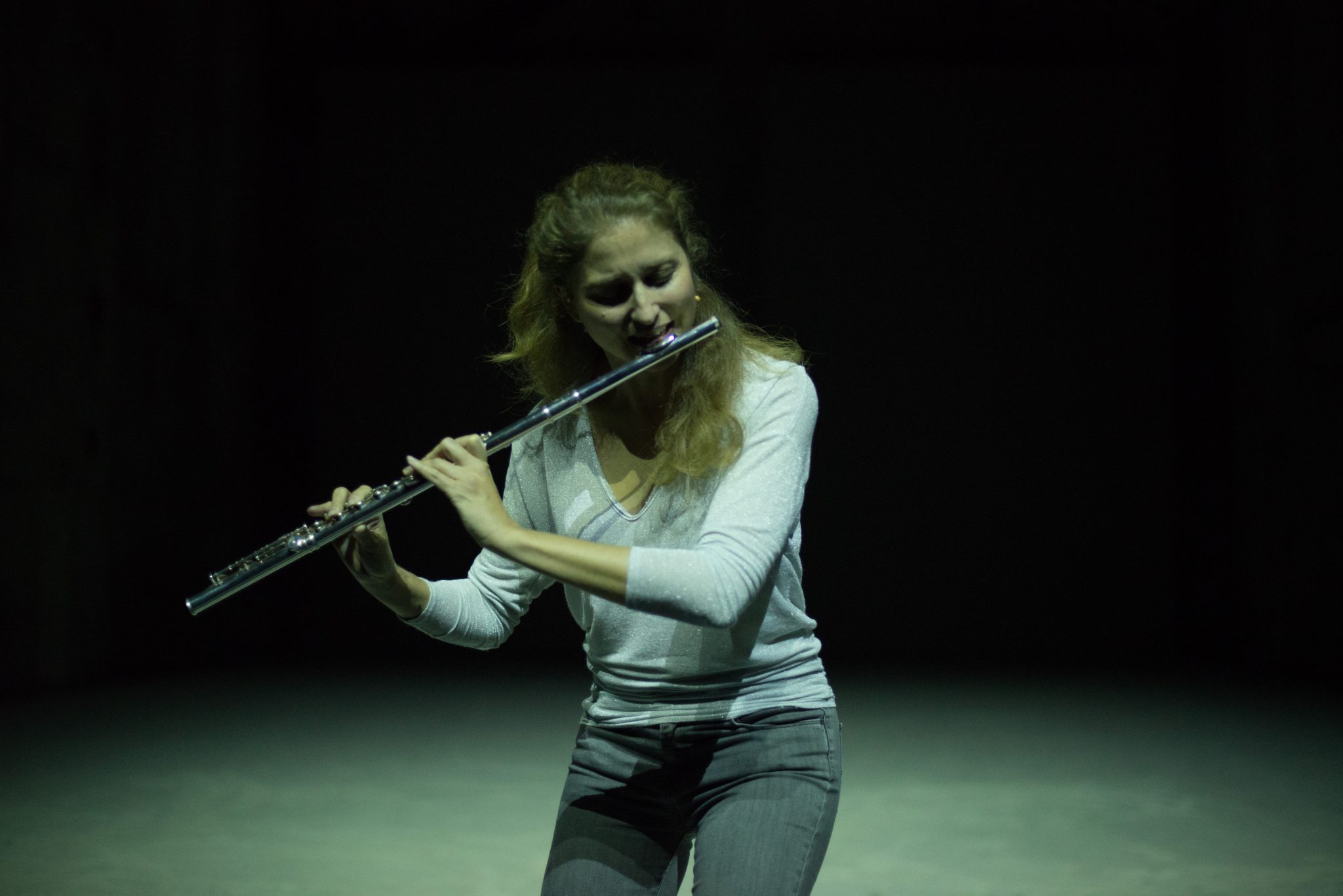 Als sich das Geschehen im Text zu einer dramatischen Wendung verdichtet, kommt Dimitriou auf die Bühne. Stellt sich ganz vor zum Publikum, knapp an den Bühnenrand und beginnt ein Stück des zeitgenössischen, italienischen Komponisten Salvatore Sciarrino zu intonieren. Es sind keine harmonischen Töne, die hier mit der Flöte produziert werden. Vielmehr ist es der Atem der jungen Frau selbst, der im Mittelpunkt steht. Das Geräusch der Klappen, der Einsatz von Obertönen, die Verfremdung des Instrumentes hin zu einem percussiven Sound – all das lässt im wahrsten Sinne des Wortes aufhorchen und zieht die Menschen im Saal in ihren Bann. Man vermeint, das Getrappel von Pferdehufen zu hören, kann sich vorstellen, wie der Wind durch die Haare des jungen Soldaten streicht und er mit der Peitsche das Tier antreibt. Man fühlt beinahe das Schnauben des angestrengten Pferdes und ahnt, dass dieser Zustand in eine Art Raserei münden wird. Gemeinsam mit dem Text, den man zuvor las, evoziert das Flötensolo „Immagine fenicia“, das immer furioser und furioser wird und in einem Galopp-Rhythmus landet, ein Getriebensein, ein Rasen, einen Zustand, der mit höchster Anspannung vielleicht am besten beschrieben werden kann.