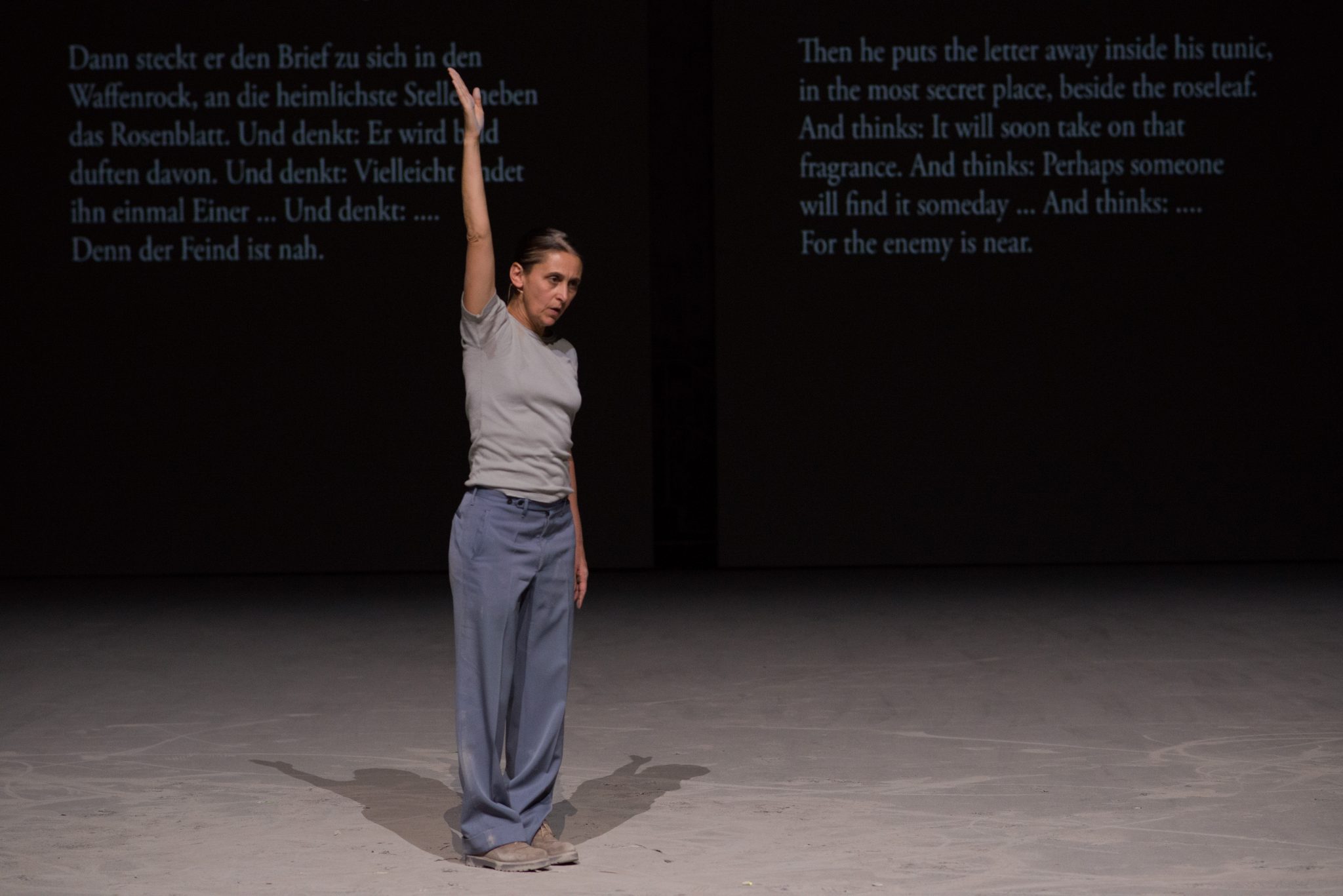 Nach dieser Szene kippt die Tanzaufführung zu einer rein theatralen Performance. De Keersmaeker bleibt alleine auf der Bühne und beginnt den Text zu rezitieren. Wie in dem äußerst informativen Artikel von Wannes Guyselinck im Programmheft nachzulesen ist, hat die Tänzerin dabei direkte Anleihen bei Tonaufnahmen von Oskar Werner genommen. Diese österreichische Schauspielikone war zeit ihres Lebens von diesem Rilke-Text fasziniert. Gleich zwei Tonaufnahmen sind von Oskar Werner erhalten. Eine, die er als junger Mann und eine, die er im Alter aufgenommen hat.