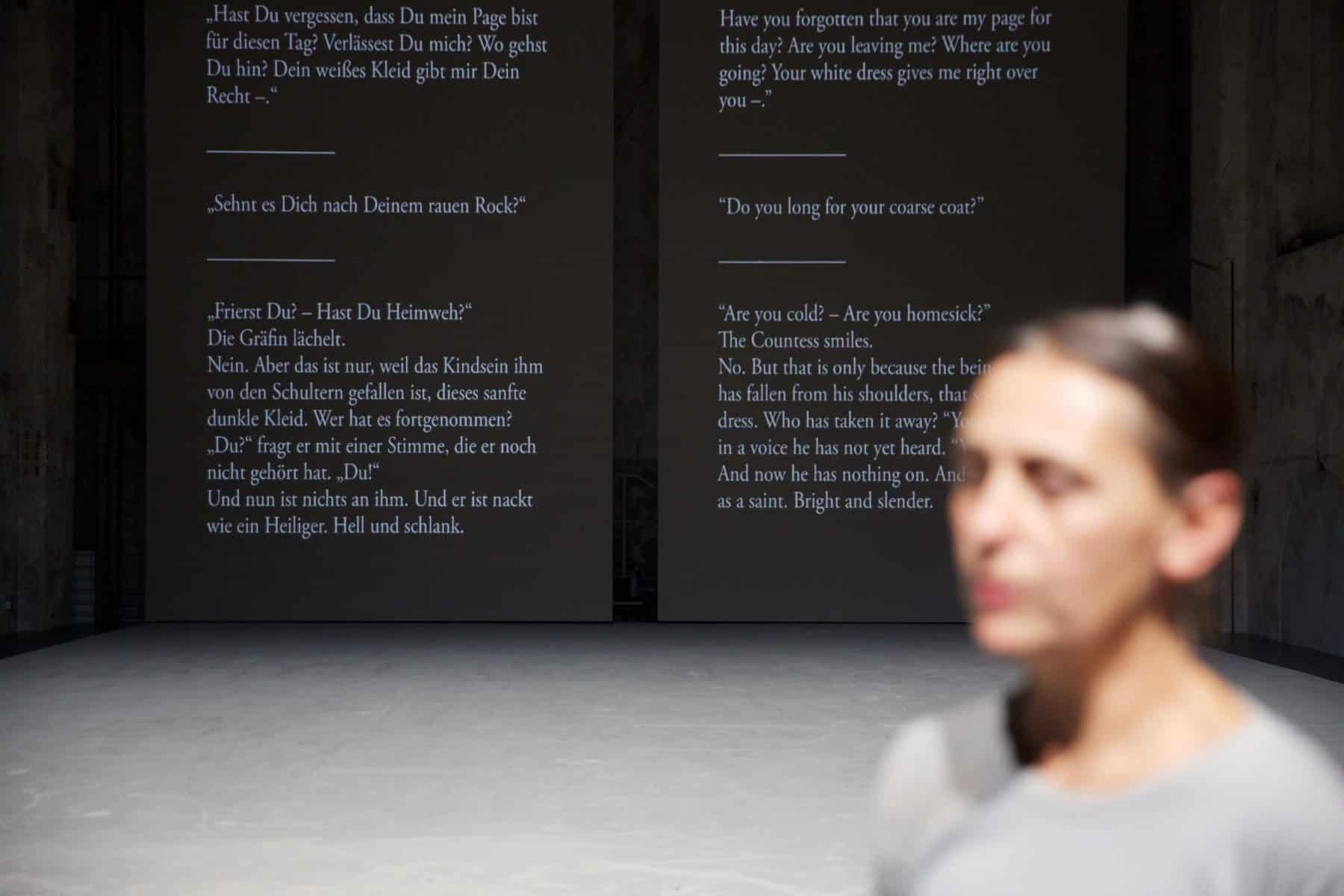 Es ist jedoch die Eindringlichkeit der Sprache von Keersmaeker, ihre Konzentration, das Wechseln der Stimmlagen, je nachdem ob sie von der Gräfin spricht oder vom Oberst, ob sie über eine Madonna am Wegesrand erzählt, oder in die Rolle des jungen Cornets schlüpft, die fasziniert. Diese vokale Bühnenpräsenz, gepaart mit reduzierten Bewegungen, die teilweise einfrieren, sie an einem bestimmten Punkt festnageln, während sie weiterspricht, ist außerordentlich. Das Oszillieren ihres Idioms, das zwischen Hochdeutsch, Flämisch und Österreichisch pendelt, ergibt ein einzigartiges Klangmuster. Gepaart mit der rhythmischen Reimform beginnt man in diesem letzten Teil zu verstehen, wie sich Klang, Atem, Satzbau und Inhalt, wie sich Musik und Tanz hier zu einem einzigartigen Kunstwerk verdichten, das wie aus Raum und Zeit gefallen scheint.