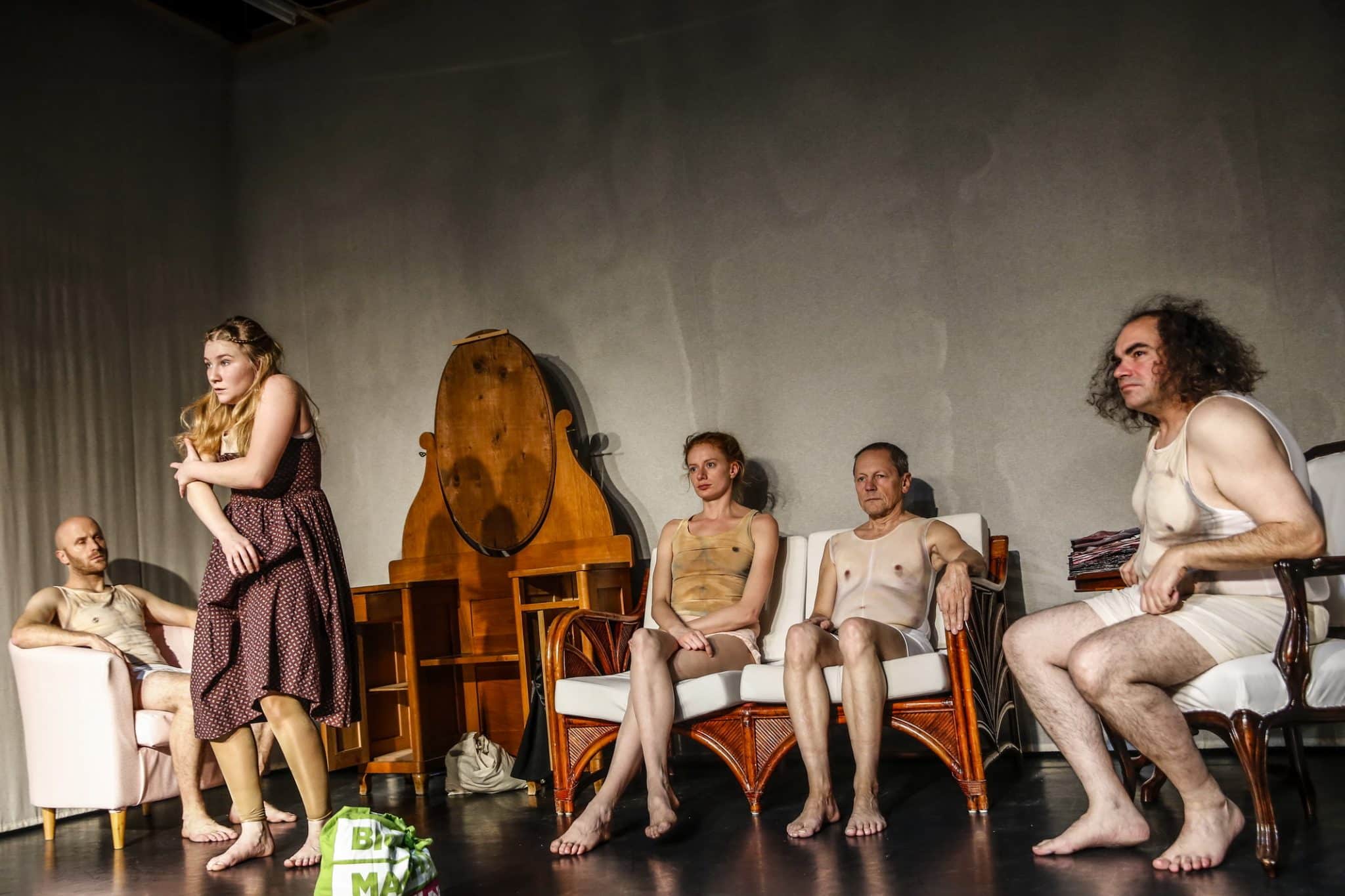 Zwei Frauen und drei Männer betreten die Bühne des Off-Theater. Eine der Frauen trägt zwei Einkaufssäcke, ein Mann liest in einem imaginären Buch. Nicht alle machen es sich auf den Sitzgelegenheiten bequem, aber alle warten offensichtlich auf das öffentliche Verkehrsmittel. (Ausstattung Devi Saha)