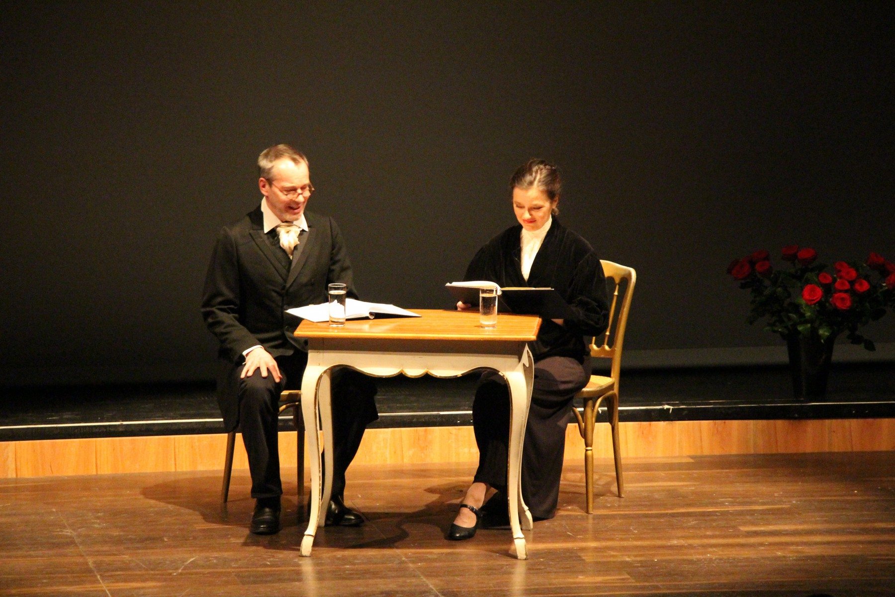 Gemeinsam mit ihrem Bühnenpartner Christoph Schobesberger trat Eisenkolb als Bertha von Suttner im historischen Kostüm vom Zuschauerraum aus auf die Bühne des MuTh. Mit viel Witz und Ironie stellte sie ihrem Partner mit einem Augenzwinkern in Richtung Publikum die rhetorische Frage: „Ob die das wissen, dass ich es dem Nobel eingeredet hab‘ mit dem Preis?“ Sehr einfühlsam, jedoch stets mit einem kräftigen Schuss Humor, wurden nicht nur aus Tagebuch-Eintragungen sehr persönliche Erlebnisse geschildert (u.a. ihre schwärmerische, erste Liebe zu Kaiser Franz Josef, oder aber auch ihre gescheiterte Gesangskarriere), sondern auch aus Korrespondenzen vorgelesen, die sie mit so bedeutenden Persönlichkeiten wie Alfred Nobel, Leo Tolstoi und Theodor Herzl führte. Ein kleines Lese-Tischchen, ein Klavier mit darauf platzierten Werken der Schriftstellerin, sowie ein großes Bukett roter Rosen lieferten einen authentischen Rahmen.