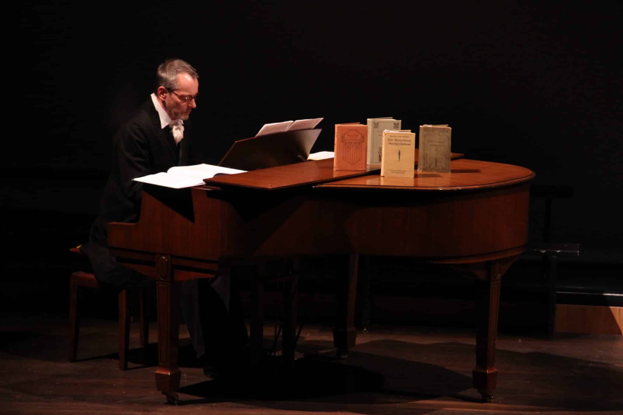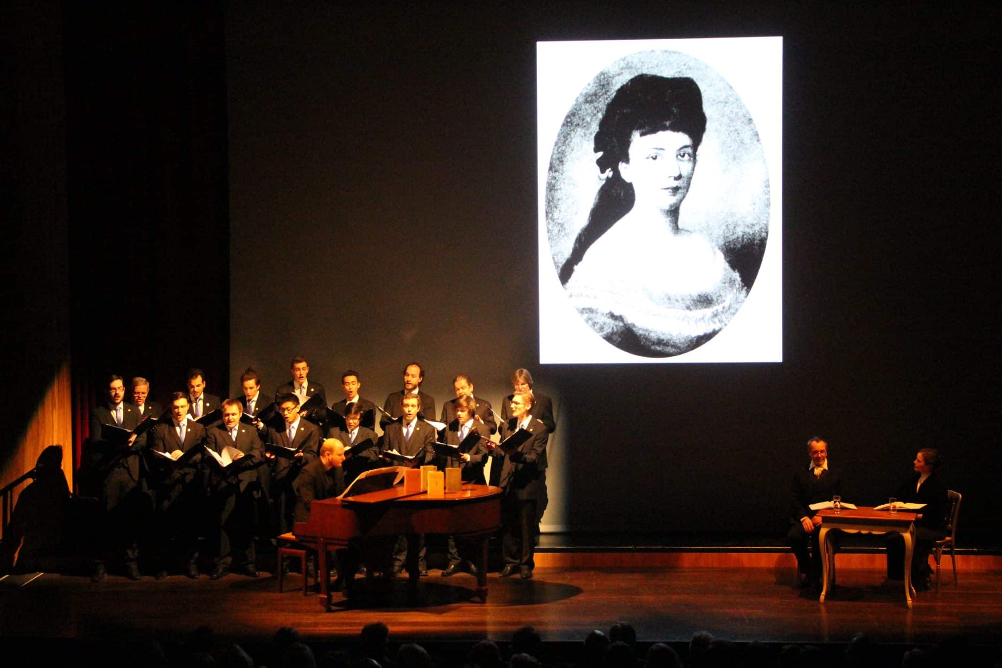Neben Schobesberger, der auch immer wieder ans Klavier wechselte und die Lesung mit Werken von Schubert, Chopin und Schumann begleitete, wurde das Programm musikalisch wunderbar vom Männerchor ehemaliger Wiener Sängerknaben, dem Chorus Viennensis, unter der Leitung von Florian Maierl gestaltet. Als besonderes Schmankerl der dargebotenen Gesangsnummern ist das von Franz von Suppé komponierte „Die Waffen nieder!“ zu nennen. 1892 anlässlich des Berner Friedenskongresses uraufgeführt, ist es von Bertha von Suttners gleichnamigem, erstem Weltbestseller inspiriert und heute selten zu hören. Die Zeit des Umbruchs, in die Bertha von Suttner geboren wurde, das ständige Aufrüsten und Säbelrasseln, wurde mit der Auswahl an Musikstücken, bis zu einem fast schon schmerzlichen Realismus, mitgetragen. Richard Strauss‘ „Schlachtgesang“ oder Herwig Reiters „Vater, komm erzähl` vom Krieg“ waren dafür zwei Beispiele. Die Blauäugigkeit der Gesellschaft im Umgang mit einem bevorstehenden Krieg, von Bertha von Suttner in „Die Waffen nieder!“ entlarvt, fasste Susanne Eisenkolb prägnant und ironisch zusammen. Die Doppelmoral der Familien, die ihre Söhne voller Stolz in den Krieg schickten, um danach inbrünstig für ihr Leben zu beten, entlarvte sie mit der Zitat: „Dass [sic!] der Tod zugleich bestimmt und durch Gebete abzuwenden sein könne, ist in seiner Widersprüchlichkeit schon fast lachhaft.“