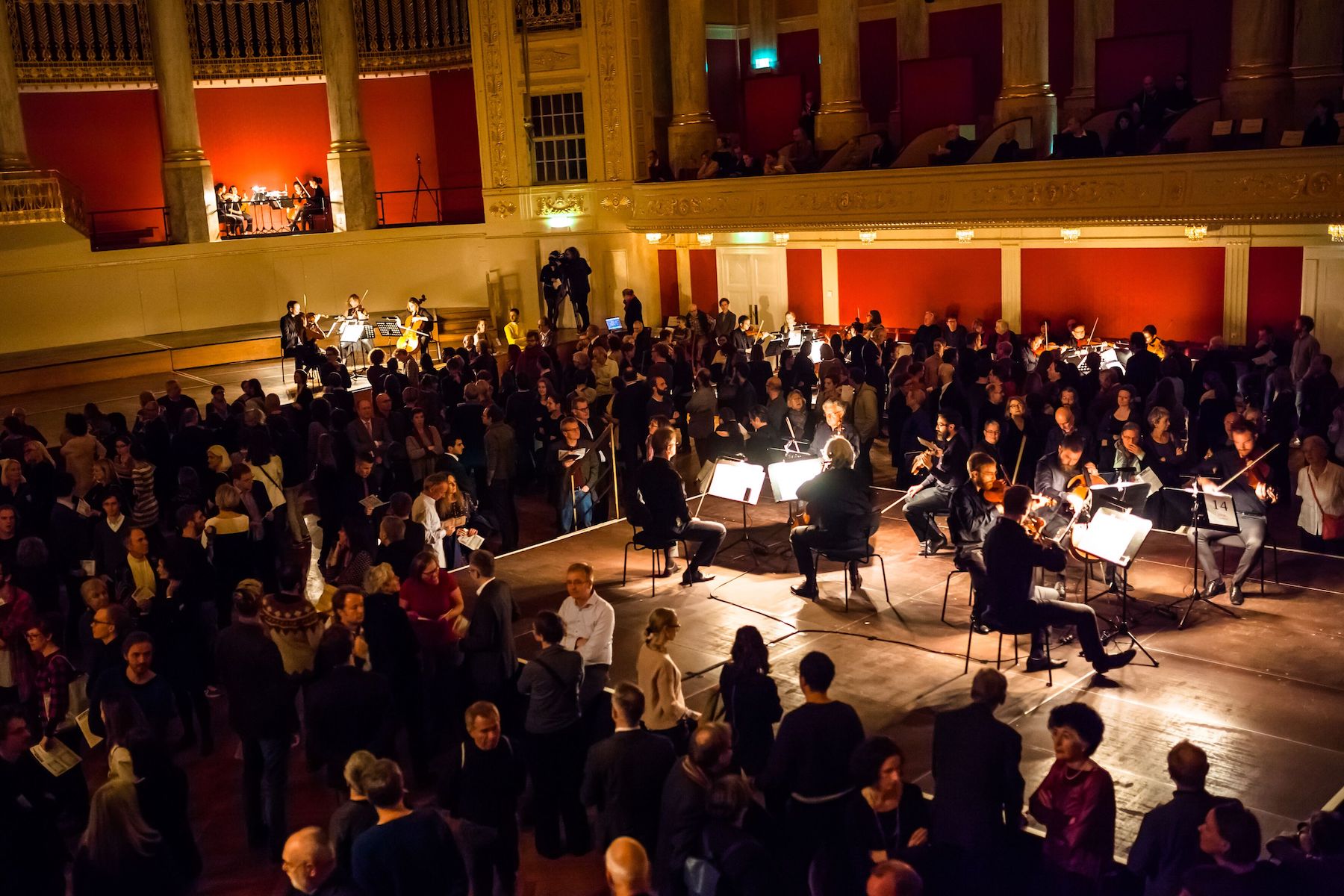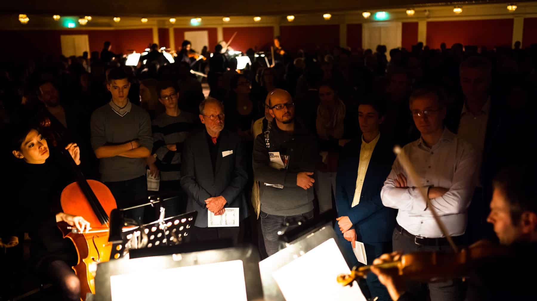 Das Ende der Aufführung, die mit 75 Minuten anberaumt war, ließ sich auch ohne jegliche Schostakowitsch-Erfahrung von seinem Klangbild her erahnen. Die allgemeine Beruhigung, die sich unter den vielen Streichern breitmachte, übertrug sich auch auf das Publikum. Seine beinahe schon laufende Gangart verlangsamte sich merklich und kam schließlich, wenige Minuten vor Schluss, ganz zum Erliegen. Die letzten fünf Minuten des letzten Satzes des Quartetts Nr. 15, durften alleine erklingen und jene Dramatik und Trauer verbreiten, die diesem Quartett innewohnen. Das traurige Flirren der Streicher und die anschließende Übernahme der kleinen Melodie in das tiefe Celloregister, das am Schluss die Bratsche übernimmt, erfolgte wie unter einem Bann. Einem Bann, unter dem das Publikum noch lange Zeit nach Verklingen des letzten Tones gefangen schien. Die lange Stille und die danach anhaltenden, lange andauernden Ovationen, waren der objektive Beweis, dass die Umsetzung der Idee der simultanen Aufführung tatsächlich funktionierte. Ein höchst außergewöhnlicher Konzertabend.