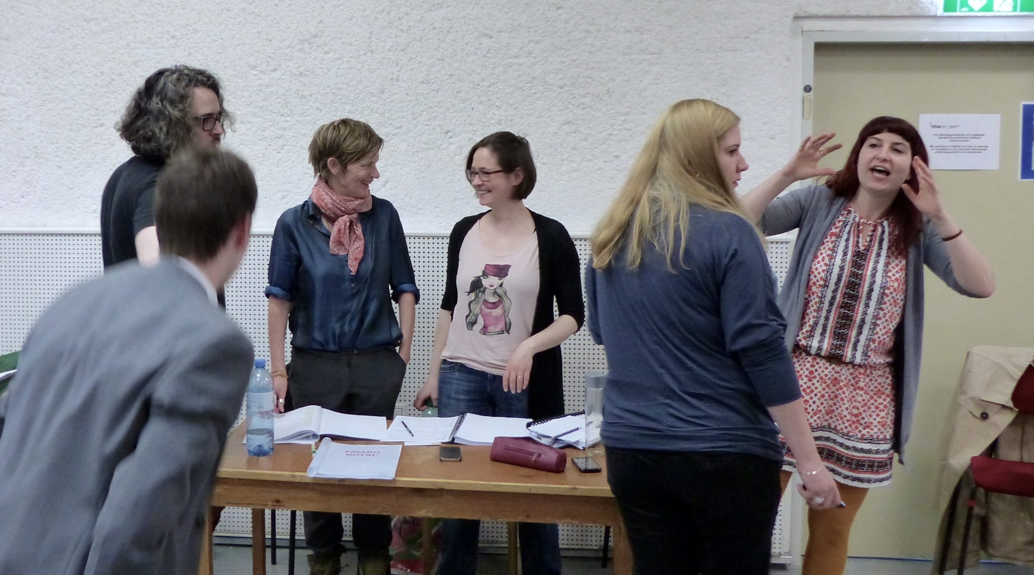 „Toll, wirklich toll, was ihr hier gezeigt habt. Eine unglaubliche Steigerung zum letzten Mal.“ Beate Göbel ist für das Schauspieltraining zuständig und teilt sich die Verantwortung für die Inszenierung mit Catherine Leiter. Sie ist schon seit 6 Jahren mit dabei und hat schon viel erlebt. Anders als bei Inszenierungen für Erwachsene können die beiden Regisseurinnen nicht von Beginn an mit einem fixen Konzept in den Arbeitsprozess einsteigen. „Wir erarbeiten gemeinsam mit den Jugendlichen die Rollen. Das schaut so aus, dass sie über das Spielen selbst, über die ersten Workshops und Improvisationen die wir machen, ihre Rolle selbst finden.“ Regie in einer Inszenierung zu führen, die erst einmal von den Jugendlichen selbst erarbeitet wird, erfordert ein hohes Maß an Flexibilität. „Diese Flexibilität hat was Lebendiges. Und wenn´s lebendig ist, dann spürt man halt alles! Wenn´s tot ist, dann spürt man halt manche Sachen nicht. Choose what you want!“ Göbel lacht, während Sie die Herausforderung an diesem besonderen Job charakterisiert. „Jetzt umziehen und in 10 Minuten sind wieder alle hier!“ In lautem Kommandoton muss sie den wieder angestiegenen Lautstärkepegel übertönen, um gehört zu werden. Der Saal leert sich in wenigen Minuten und was bleibt, ist wohltuende Stille. Zumindest für 10 Minuten.