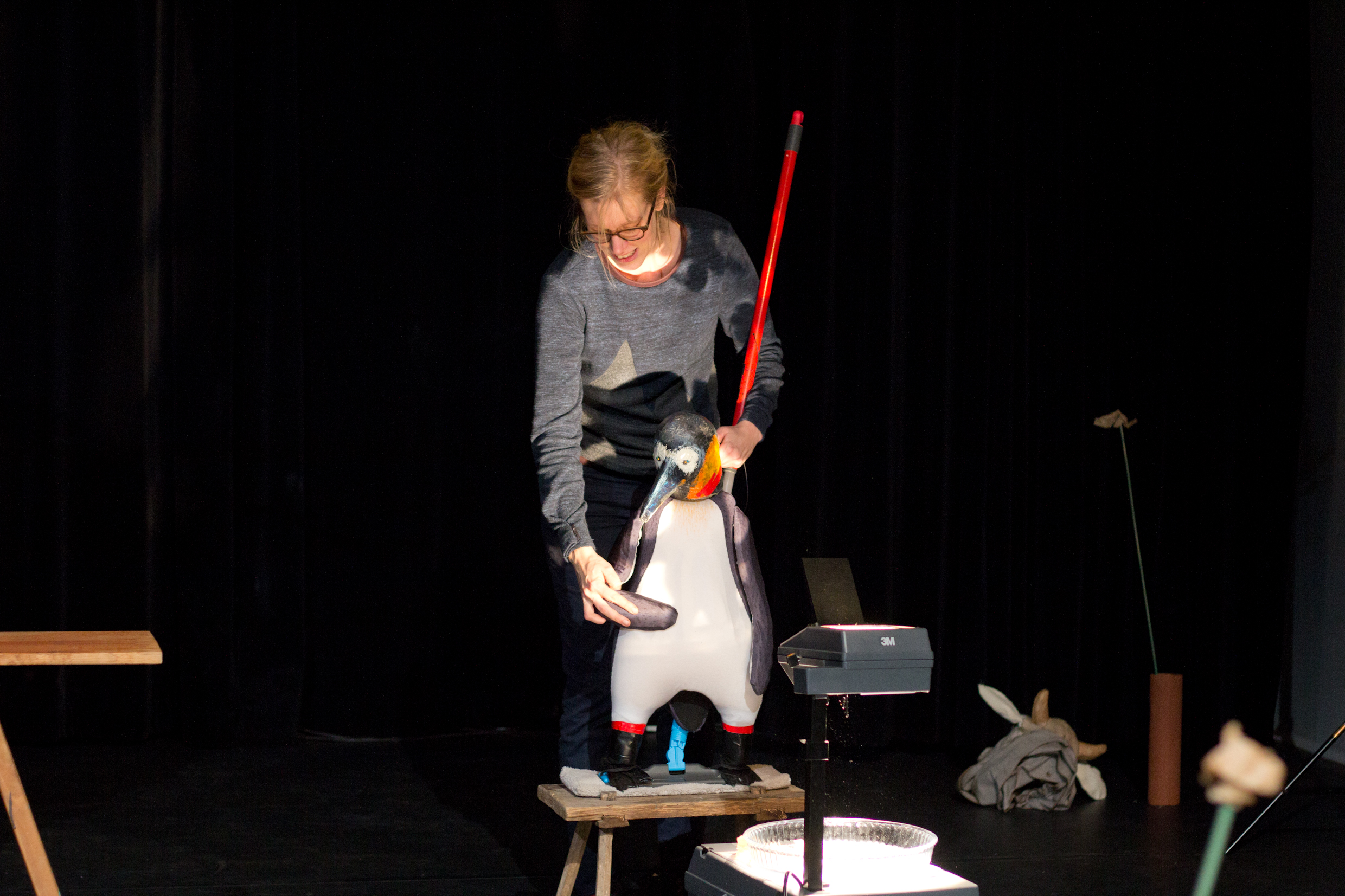 Zu Beginn sind Manfred Engelmayr, Birgit Kellner und Christian Schlechter erst einmal damit beschäftig, sich die Requisiten auf der Bühne zurechtzurichten. Dabei werden Overheadprojektoren verschoben und eine kleine, improvisierte Drehbühne aufgebaut. Schließlich brauchen die Puppen, die danach in Erscheinung treten, auch ein dementsprechendes Umfeld.