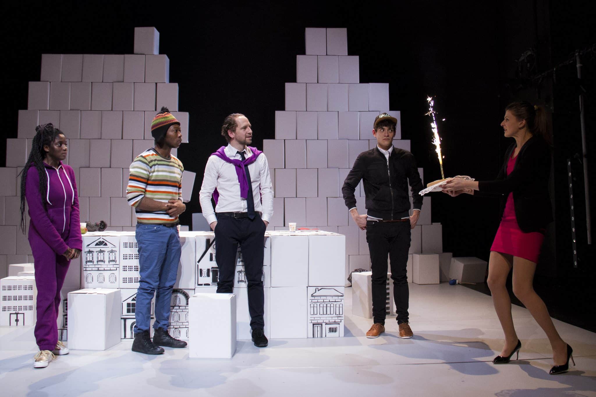 Thea Hoffmann-Axthelm schuf ein Surrounding aus weißen, übereinander gestapelten Schachteln, auf die zeitweise Live-Aufnahmen von kleinen Kameras projiziert werden. Auf den Schachtelrückseiten sind verschiedene Architekturteile wie Fenster gemalt, aber auch kleine Häuser, die je nach Bedarf neu zusammengruppiert werden.