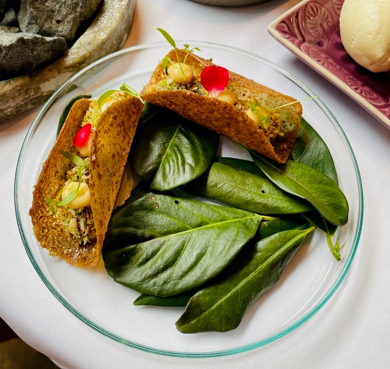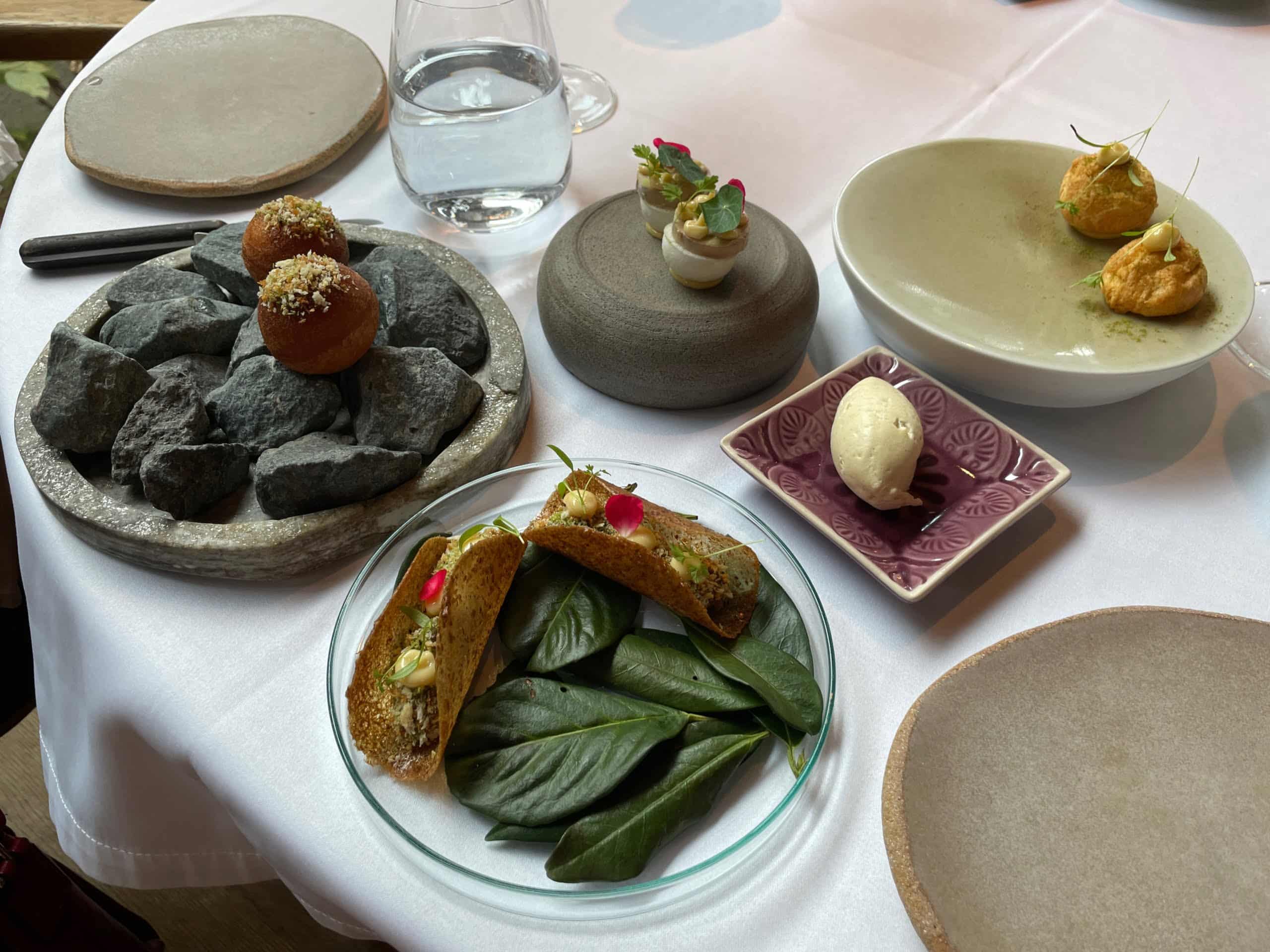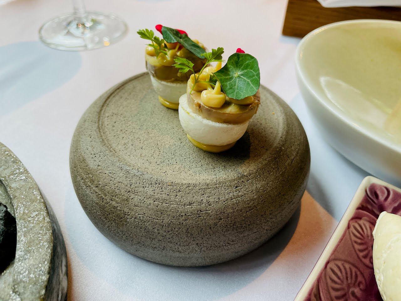 „Wir Amuse-Gueule-Bissen machen den Auftakt und zeigen euch, wie der Herbst schmecken kann!“ Gänseleber mit Steinpilzcreme, Krapfen mit Rinderfüllung, Tacos mit Hirsch-Tartar und eine Steinpilzbutter in Gesellschaft eines hausgebackenen, weißen Sauerteigbrotes bereiten einen fröhlichen Einstand.