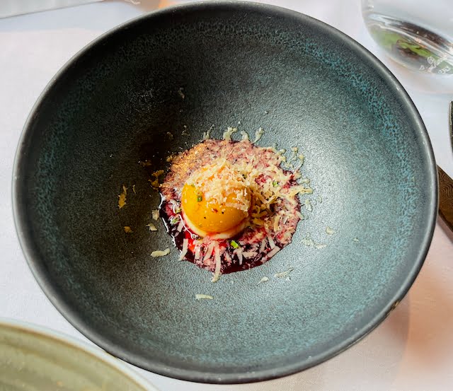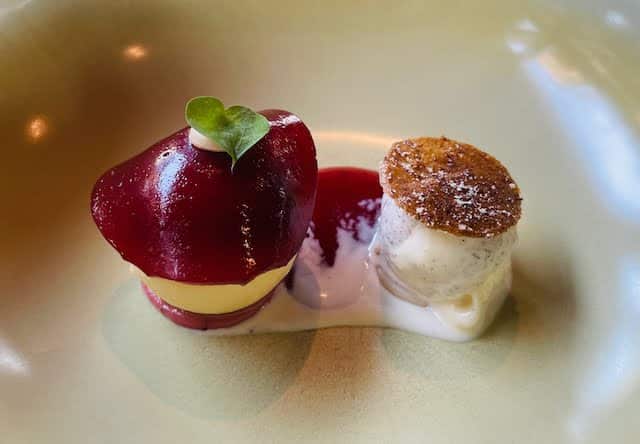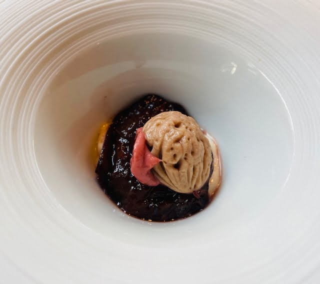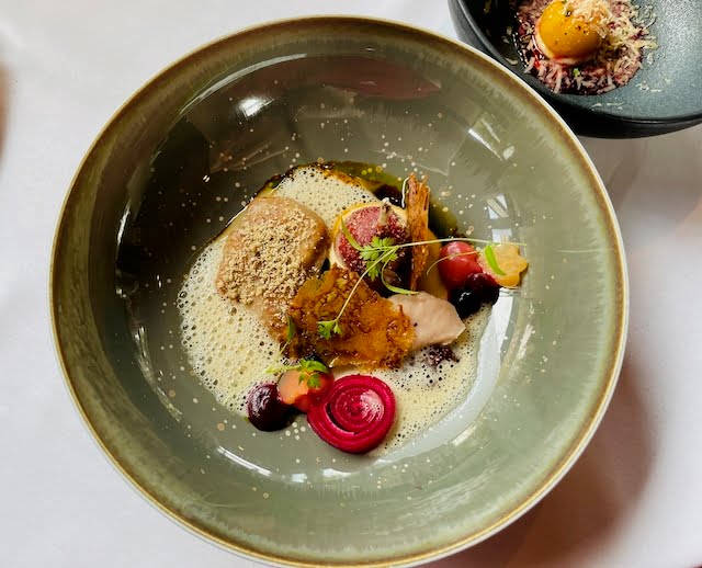 Was schon mit der Reinanken-Kostümierung begann, findet auf dem Wachtelteller seine unübertroffene Fortsetzung. Wachtelbrüstchen und -haxerl haben ein „falsches Wachtelei“ im Schlepptau, das sich als verzauberte gelbe Rübe und Sellerie mit darüber geriebener Gänseleber herausstellt. Feigen und Rote Bete leuchten, als ob ihnen bewusst wäre, was ohne sie fehlen würde.