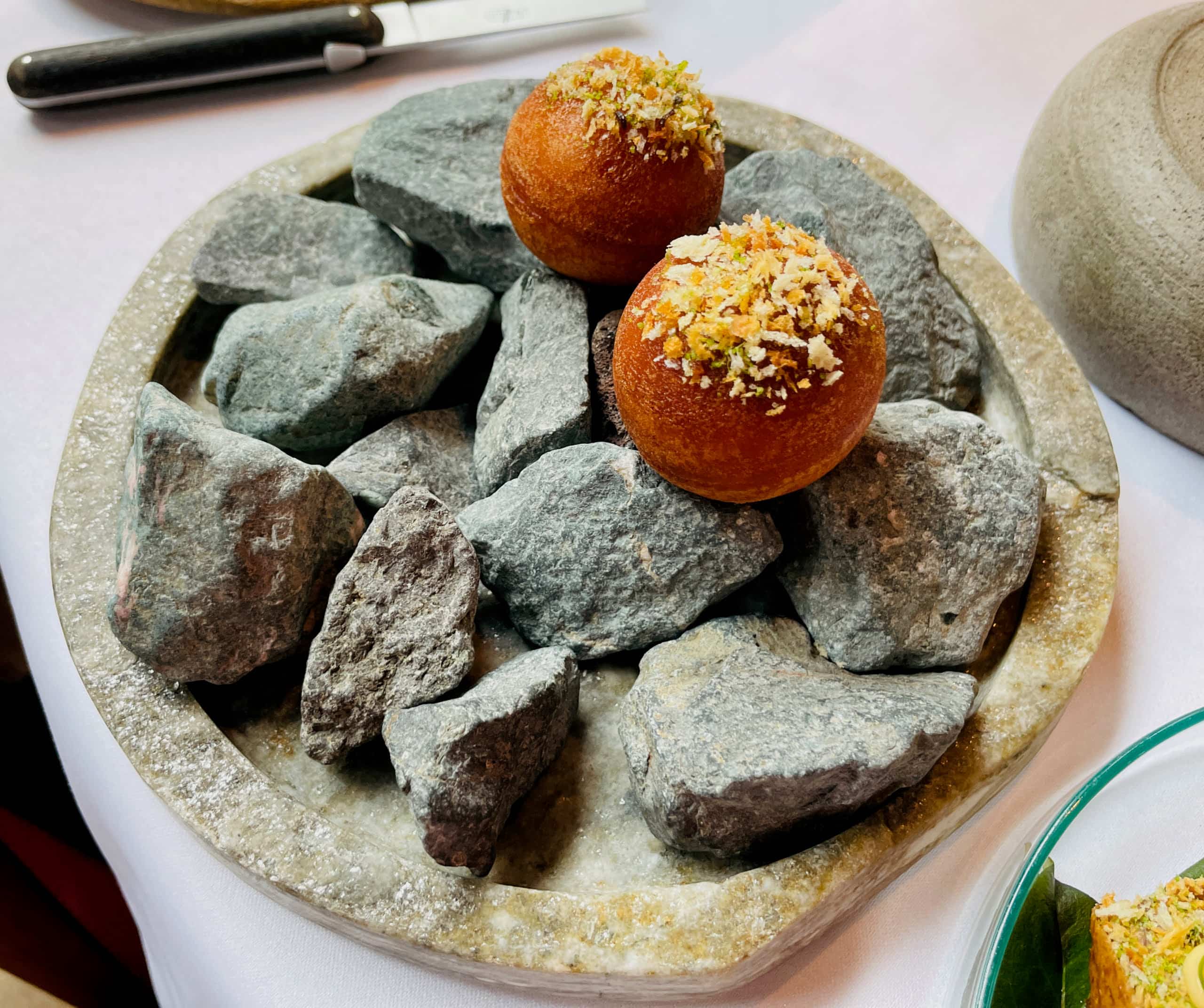 Zum Abschluss entzücken dunkle und weiße Trauben mit dem Anspruch: „Wenn wir uns schon verkleiden, dann in Haute-Couture“. Diese kommt als Eisstangerl, als Praline oder Knödelchen mit Füllung einher und lässt noch gnädig ein Mochi mit Kokosgeschmack mit auf den Laufsteg.
