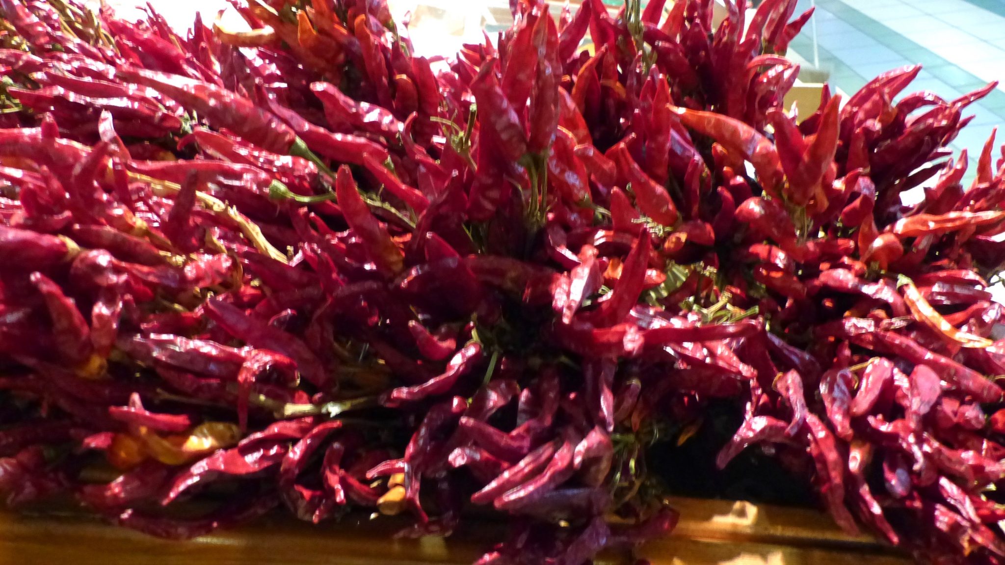 Neben Fleisch gibt es eine wunderbare Auswahl an Obst und Gemüse. Wobei die vielen Arten von Paprika, begonnen vom Frische-Angebot, bis hin zu den getrockneten Schoten, im wahrsten Sinn des Wortes ins Auge stechen.