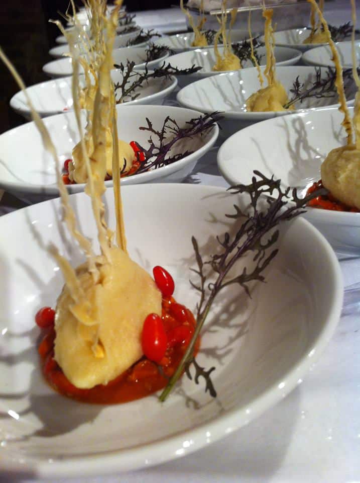 Und damit es nicht nur beim Lippenbekenntnis eines Gaumenkitzels blieb, verwöhnten Unternehmen der Wiener Spitzengastronomie die Gäste mit wunderbaren Überraschungen im Glas oder am Teller, die wahre Geschmacksexplosionen bereithielten. „Topinamburmousse mit Apfelchutney und hausgeräuchertem Bauchspeck“, eine Kreation des Sternekochs Bernhard Frais vom Imperial Riding School Renaissance Hotel, lockte gleich nach dem Eingang in den Festsaal. Rainer Kratzer vom Grand Hotel Wien präsentierte „In Limonenöl gebeizter Seesaibling mit Kürbiscreme auf gepopptem Wildreis und Blutampfer“. Das Palais Hansen Kempinski verwöhnte mit einer Kreation von Anton Pozek: „Fermentierte Karotte auf Quinoasalat mit Grapefruitgel und –eis dazu Crunch und Marmelade von der Zwiebel“.