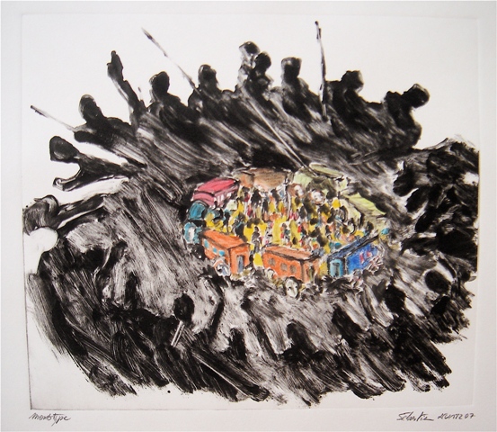Die Ausstellung des Künstlers Sebastien Kuntz im Untergeschoss des Pôle-Sud, die zeitgleich mit den Aufführungen präsentiert wurde, zeigte schwarz-weiße aber auch Farblithographien zum Thema. Im Kreis zusammengepferchte, bunte Wagenkolonnen, umgeben von Soldaten mit Waffen, assoziieren die Verfolgung der „Tziganes“ während des Vichy-Regimes und dann unter den Nazis. Seine, einem leichten Strich folgenden Beschreibungen der Vernichtung, atmen den Wind des Vergessens und lassen Unbeschreibliches tatsächlich unbeschrieben. Wie von einem Hurricane werden ganze Pferde- und Wagenkolonnen in die Lüfte emporgehoben, um zu verschwinden aus dem Hier und Jetzt. Es sind keine einzelnen Gesichter, keine einzelnen Persönlichkeiten, die er wiedergibt, sondern die Zusammenballung von Menschen, die sich der Tyrannei ihrer Verfolger nicht erwehren können. So bunt ihre Wagen, so schwarz ist die Übermacht ihrer Feinde. Die Erhebung in die Lüfte ist der einzige Lichtblick, der aber nicht zum Leben, sondern zum Tod führt. Ein Auflösen, das einer Erlösung gleichkommt.