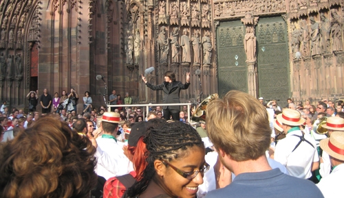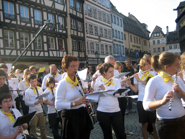 So geschehen zum Beispiel am vergangenen Wochenende, an welchem das Festival Musica, ein Festival für zeitgenössische Musik eröffnet wurde. Dies geschah am Samstagnachmittag mit dem Konzert „Fresco“ für 5 Blasorchester von Luca Francesconi, einem 1956 geborenen Italiener. Dieser ging in seinem Werk der Frage nach, wie man heute Musik aus den heiligen Hallen des Konzerthauses nach außen transportieren könne und schrieb eine Partitur, in welcher er die 5 ausführenden Orchester als „große, musikalische Tiere“ bezeichnet. Jedes Orchester, ausgestattet mit einem Bläser- und Schlagwerkkörper von insgesamt ca. 50 Personen, bewegte sich von jeweils anderen Ausgangspositionen, die ungefähr 500 Meter im Umkreis der Kathedrale lagen, hin zum zentralen Treffpunkt vor der beeindruckenden gotischen Kirche. Die Blasmusikkapellen, rekrutiert aus kleinen Orten des elsässischen Umlandes, spielten ein und das selbe Stück während ihres Ganges zum Münsterplatz immer und immer wieder. Genauer gesagt waren es 5 Landeshymnen, wobei jeder Klangkörper nur eine Hymne intonierte. Man konnte einem Orchester zu Fuß auf seinem Weg zum Zielpunkt folgen und hörte, je näher man diesem Platz kam, auch von ferne die Klangfetzen der anderen Kapellen. dem Platz vor der Kathedrale befanden sich die Zuhörer zwischen den einzelnen Orchestern, die sich sternförmig postiert hatten. Sie hatten sich nach dem Zufallsprinzip an ihren Plätzen eingefunden, teils waren sie unwissend als Passanten dazugekommen, teils hatten sie die Aufführung jedoch auch erwartet, ihr jeweiliger Standplatz ergab sich aber aus der Verschiebung der Menschenmasse, die den Orchestern Platz machen mussten. Nun folgten die Musiker einem jungen Dirigenten, der die 5 Orchester als eine Formation dirigierte. Die klangintensive Musik bewegte sich in Wellen zwischen den einzelnen Kapellen hin und her und schwoll bis zu ihrem Höhepunkt an, ohne jedoch danach abrupt zu enden. Denn die Musiker innen und Musiker begannen, sich spielend zurückzuziehen, indem sie sich ihren eigenen Weg durch die Menschenmenge, weg vom Platz bahnten. Auf diese Weise verklang das Stück auf andere Weise, wie es in der