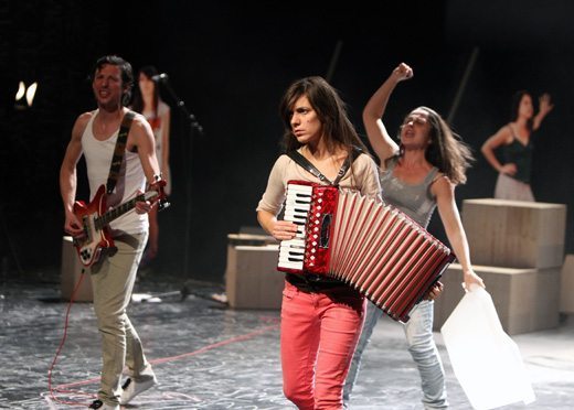 Die mehr oder weniger lose Reihenfolge unterschiedlicher Themenkreise wurde jäh unterbrochen. Ein wahres Anklagefeuerwerk prasselte auf die Zuseherinnen und Zuseher ein, im welchem Ungerechtigkeiten am laufenden Band aufgezählt und ihnen nichts anderes als Gewaltlosigkeit entgegengesetzt wurde. Ohne Unterlass wurden Gräueltaten aufgezählt, die sich von psychischen hin zu physischen Gewalttaten steigerten. Ganz nach dem Motto: Der Kluge gibt solange nach, bis er der Dumme ist. Doch auch das Sprichwort in dem veranschaulicht wird, dass ein einziger Tropfen ein Fass zum Überlaufen bringt, kam im Anschluss zu seinem Recht. Denn nach all den Erniedrigungen, gegen die es keine adäquate Reaktion gab, um weiteres Übel endlich aufzuhalten, verwandelte sich die Bühne in ein Schlachtfeld. Zu Heavymetal-Klängen veranstalteten die Protagonistinnen und Protagonisten so etwas wie eine Revolution im Wasserglas, bei der mit Gegenständen herumgeworfen und Klopapierrollen sinnbildhaft als Explosionsmaterial eingesetzt wurden. Nun war der Damm gebrochen. Niemand mehr sicher vor dem nächsten Geschehen. Und doch blieb das Publikum in Wien ziemlich distanziert, denn niemand ließ sich darauf ein, von den Agitationsparolen, die gegen die Sitzreihen gebrüllt wurden, mitgerissen zu werden.
