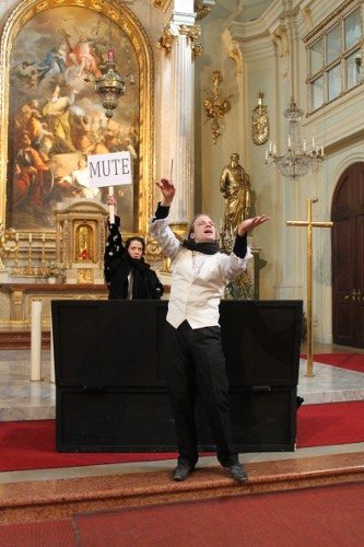 Der Schauplatz der Handlung übte vor allem im zweiten Teil der Aufführung – auf der Orgelempore selbst – einen wundersamen Zauber aus. Hier dirigierte Schubert unter anderen seine allererste Messe. In bitterer Kälte, eingemummelt in bereitgelegte Decken, wirkte der Raum in ganz spezieller Art und Weise. Kein Konzertsaal kann diese Emotionen und Assoziationen wecken, keine noch so brillante Tonwiedergabe so tief berühren wie dieser authentische Ort. Lisa Rombachs klare und helle Stimme, begleitet von Fiona Pollak an der Orgel, ergänzte das Geschehen mit wohl ausgesuchten Liedern wie der Danksagung an die Kunst, die Schuberts imaginären Dialog mit Beethoven abschloss. Subtil wurde darin über die Rolle der Kunst im eigenen Leben nachgedacht und gipfelte in der Ansage: „Man will doch seine Vollendung. Wenn schon nicht im Leben, dann in der Kunst!“