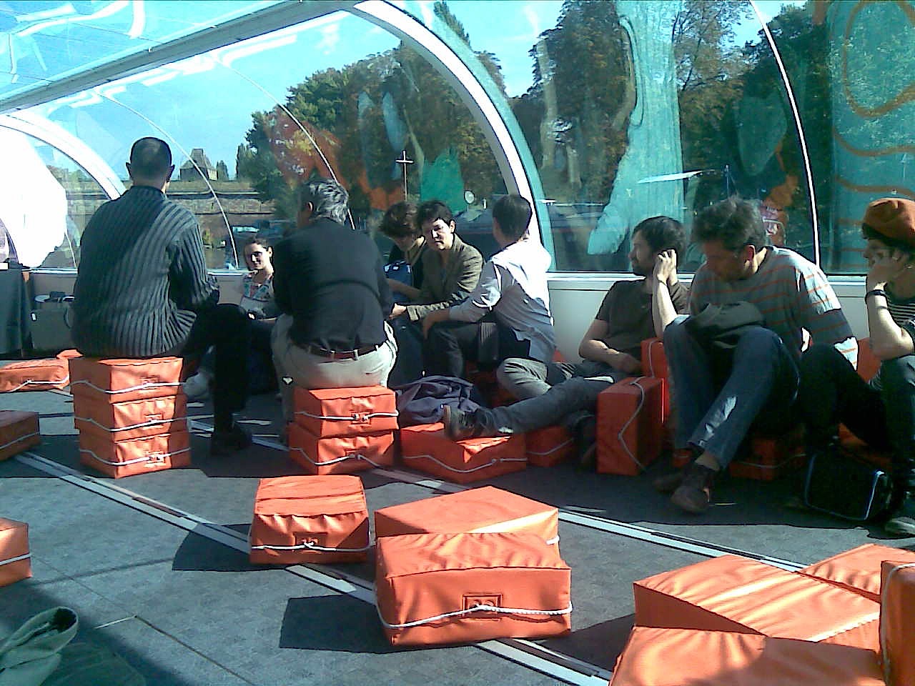 Doch dieses Mal ist es ganz anders. Anstatt der Bankreihen, die sich normalerweise in den Booten befinden, ist dieses leer, nur mit vielen orangefarbigen Rettungskissen bestückt. Die ungefähr 30 Passagiere haben sich darauf nach Lust und Laune niedergelassen, manche liegen, manche lümmeln, manche sitzen aufrecht und lauschen der Soundinstallation, die uns über 2 Stunden lang begleitet. Im hinteren Teil des Bootes, aber doch mitten unter uns, haben der Komponist und seine Helfer ihre Computer und andere Gerätschaften aufgebaut, aus denen sie Klangwelten entstehen lassen, die genau für diese Fahrt konzipiert wurden.