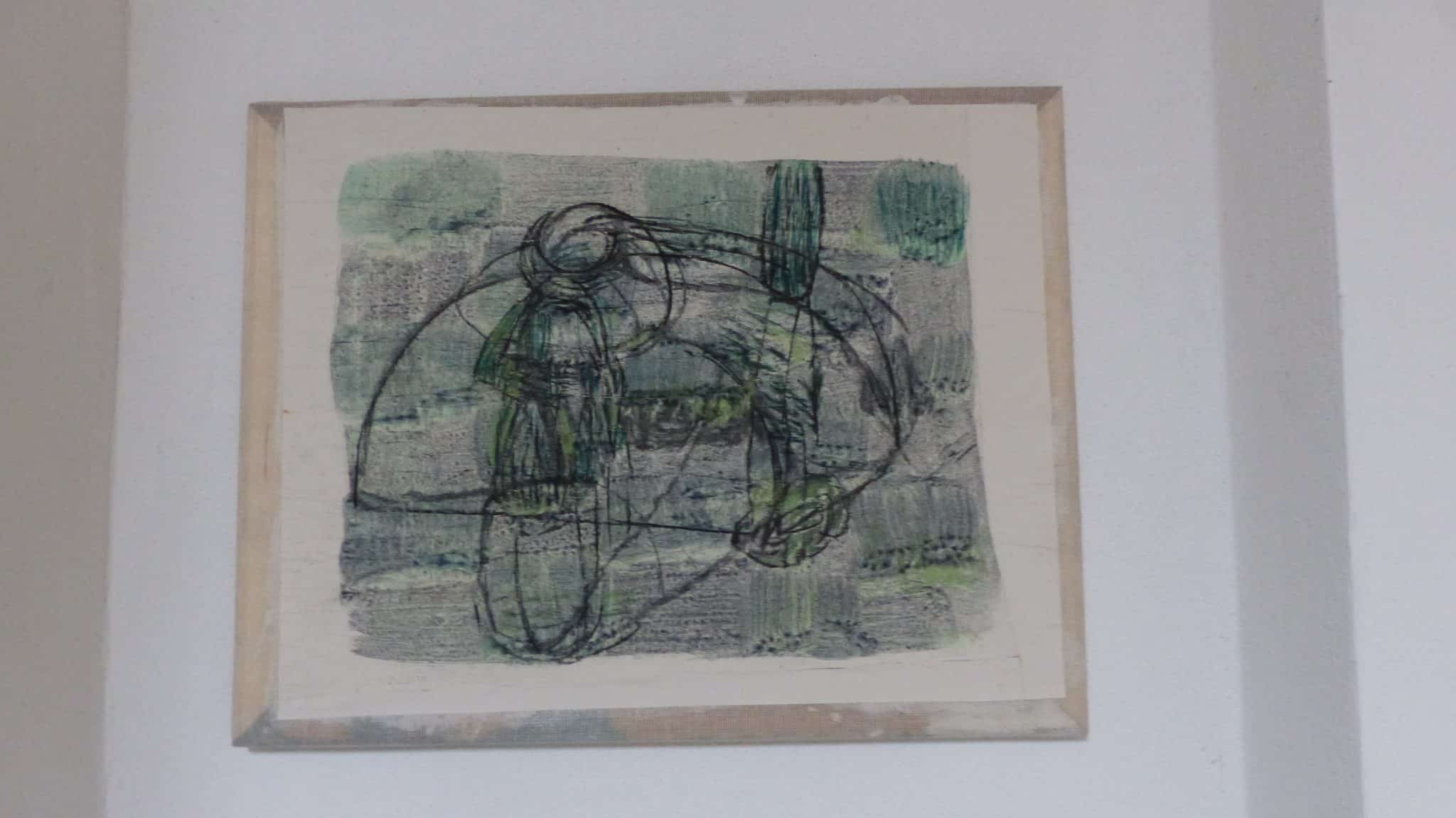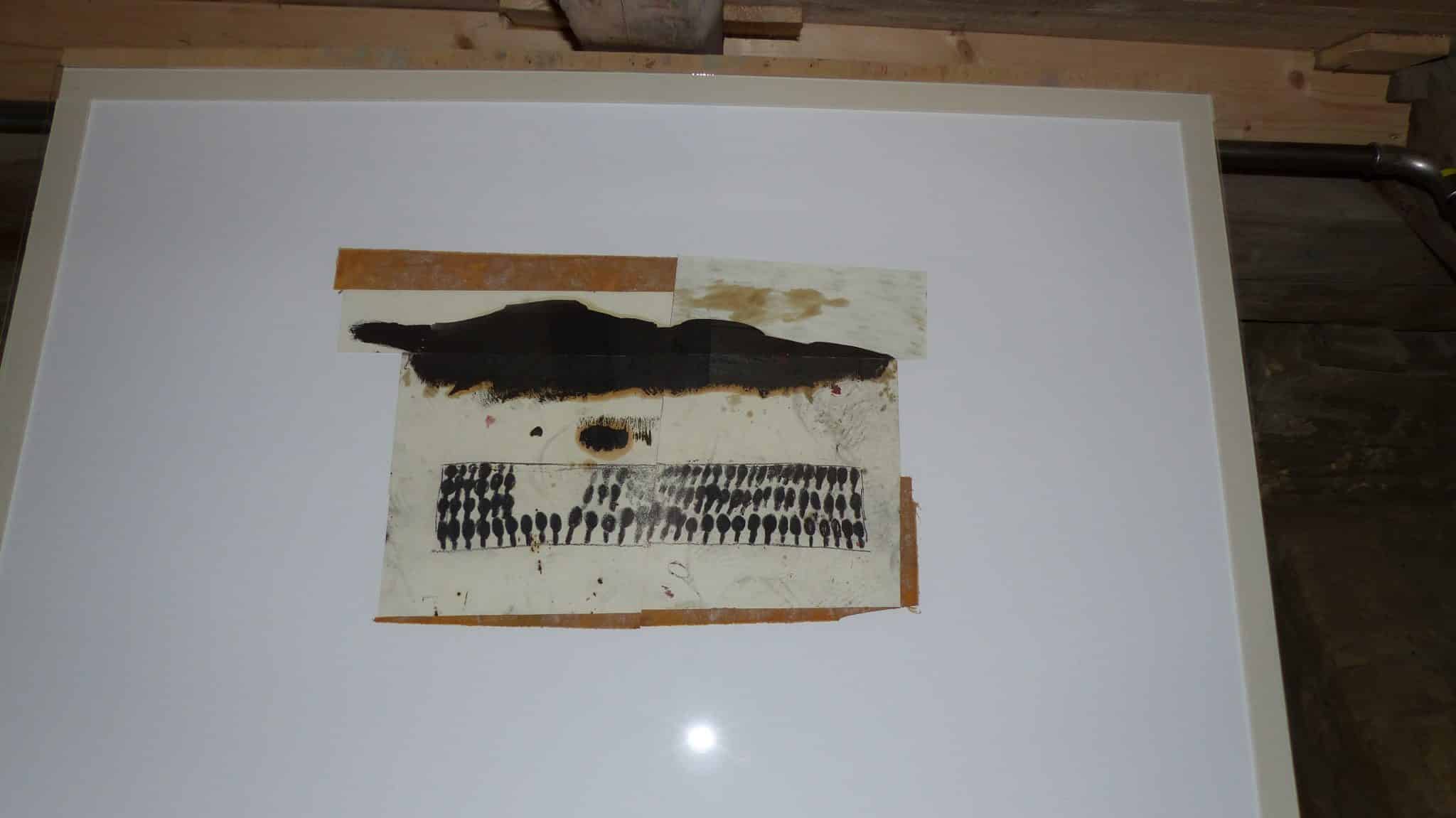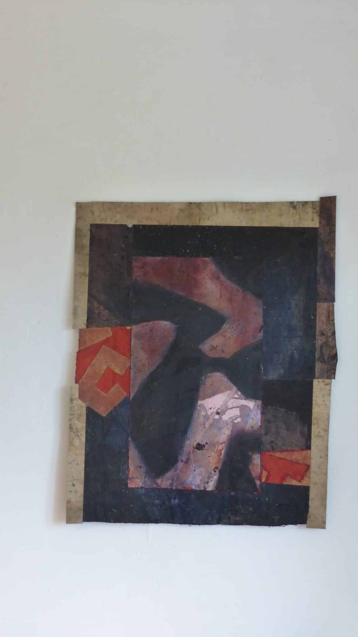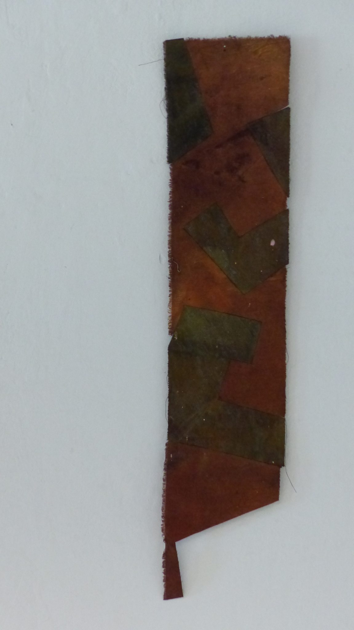 Die Frage bezog sich auf ein schmales, langes Format in dessen Mitte ein Stoffstreifen eingenäht ist. Schwarze, breite Winkel sind darauf in unregelmäßiger Reihenfolge verteilt, heben sich ab vor einem Blau und einem Grün, das unmerklich ineinander übergeht, ohne jedoch an einem gewissen Punkt seine eigene Autonomie aufzugeben. Eine Stoffbahn, die sich unendlich fortsetzen ließe, würde nicht an einer Seite, an einem Ende die helle Umrahmung enden. Die bunte, eingenähte Bahn macht Anstalten, sich weiter im Raum ausdehnen zu wollen, aber ohne Halt beiderseits, so hat es den Anschein, gibt sie rasch auf. „Es sind Formen, die sich auf afrikanischen Stoffen finden, die ich hier aufgreife“, kommt die künstlerische Erläuterung und knapp danach: „Altgriechisch lernen und einen Nähkurs machen“, will der Düsseldorfer, der neben seinem Kunststudium an der Düsseldorfer Akademie auch Philosophie abschloss. Diese Aussage zeigt, wie breit sein Interessensspektrum angelegt ist. Nicht, dass er die Sprache nicht schon einmal gelernt hätte, aber sowohl seine Sprachkenntnisse als auch seine Nähfertigkeiten findet er unvollkommen. Das eine braucht er, um Philosophisches im Original besser lesen, das andere, um geplante Stoffarbeiten perfekter ausführen zu können. „Dazu brauche ich aber auch noch eine Industrienähmaschine, die dickes Material verarbeiten kann. Ich glaube, das wird ziemlich schwierig werden“. Auch das sind Herausforderungen, von denen man nicht annimmt, dass sie sich einem Künstler stellen.