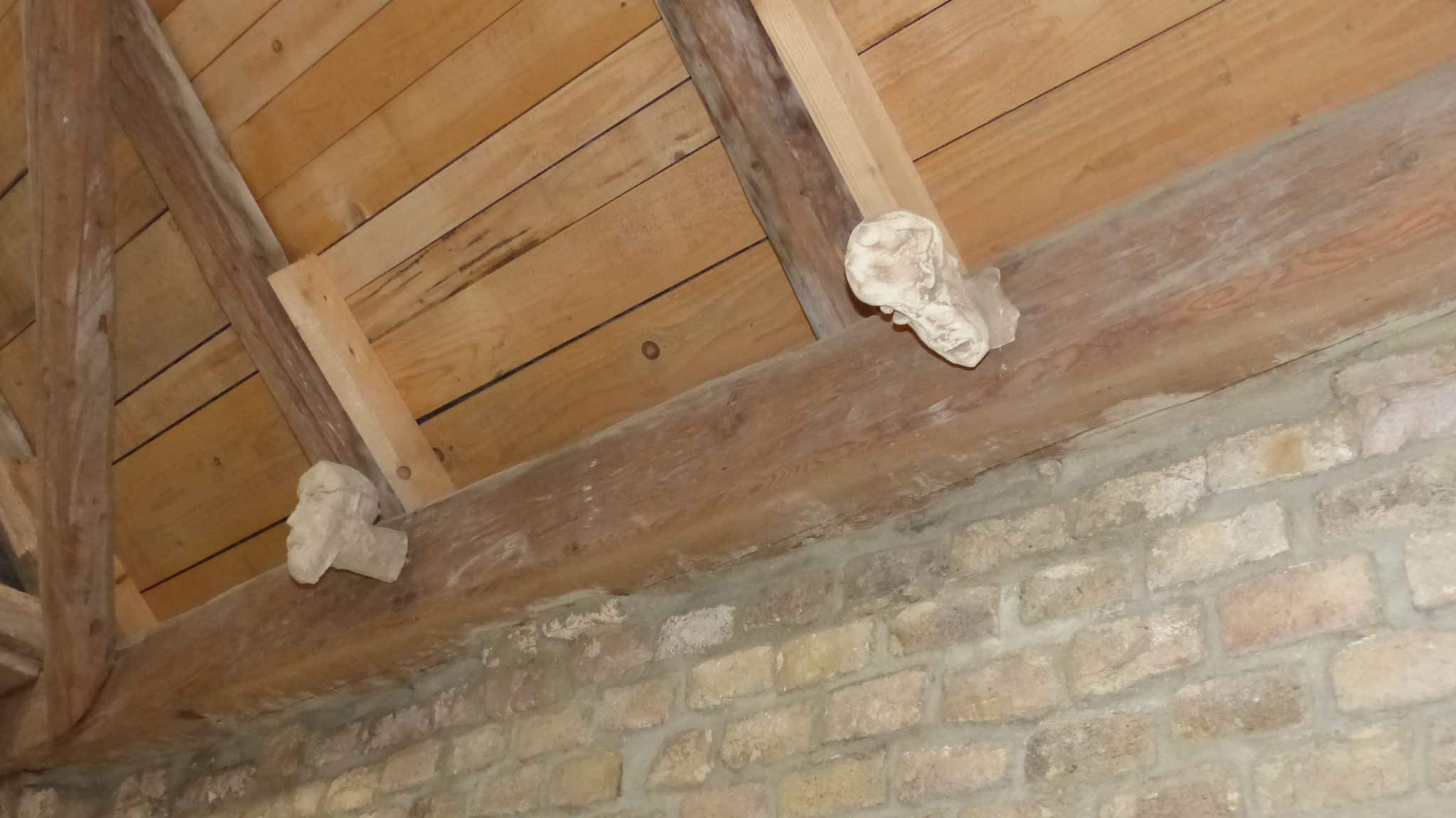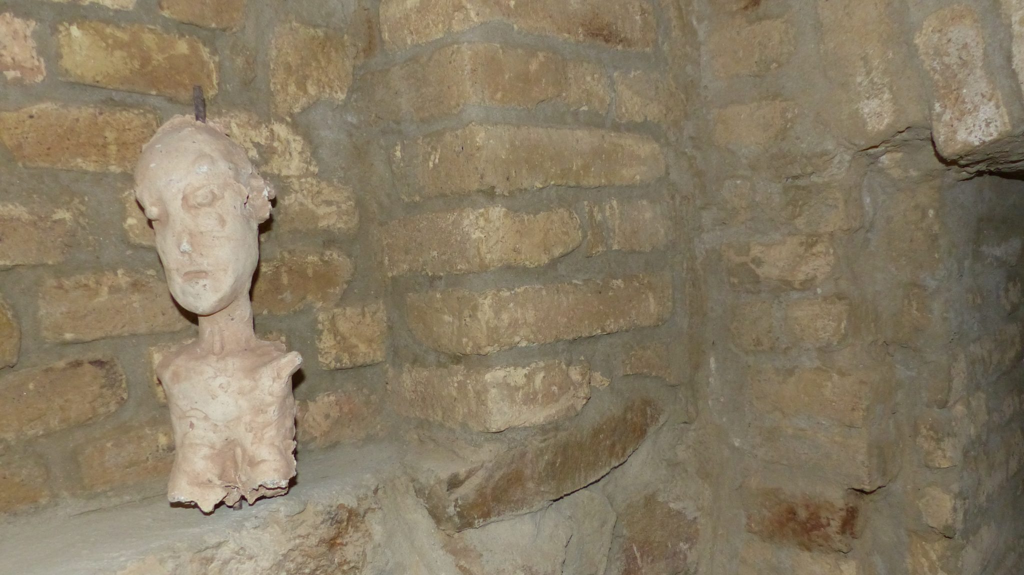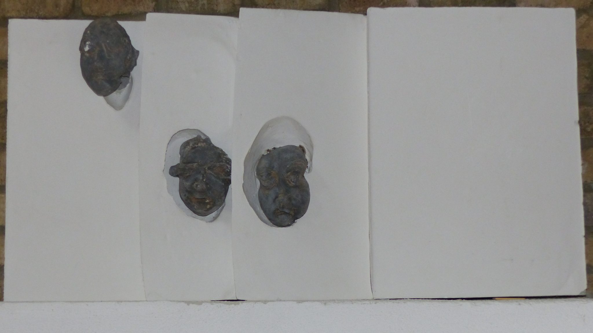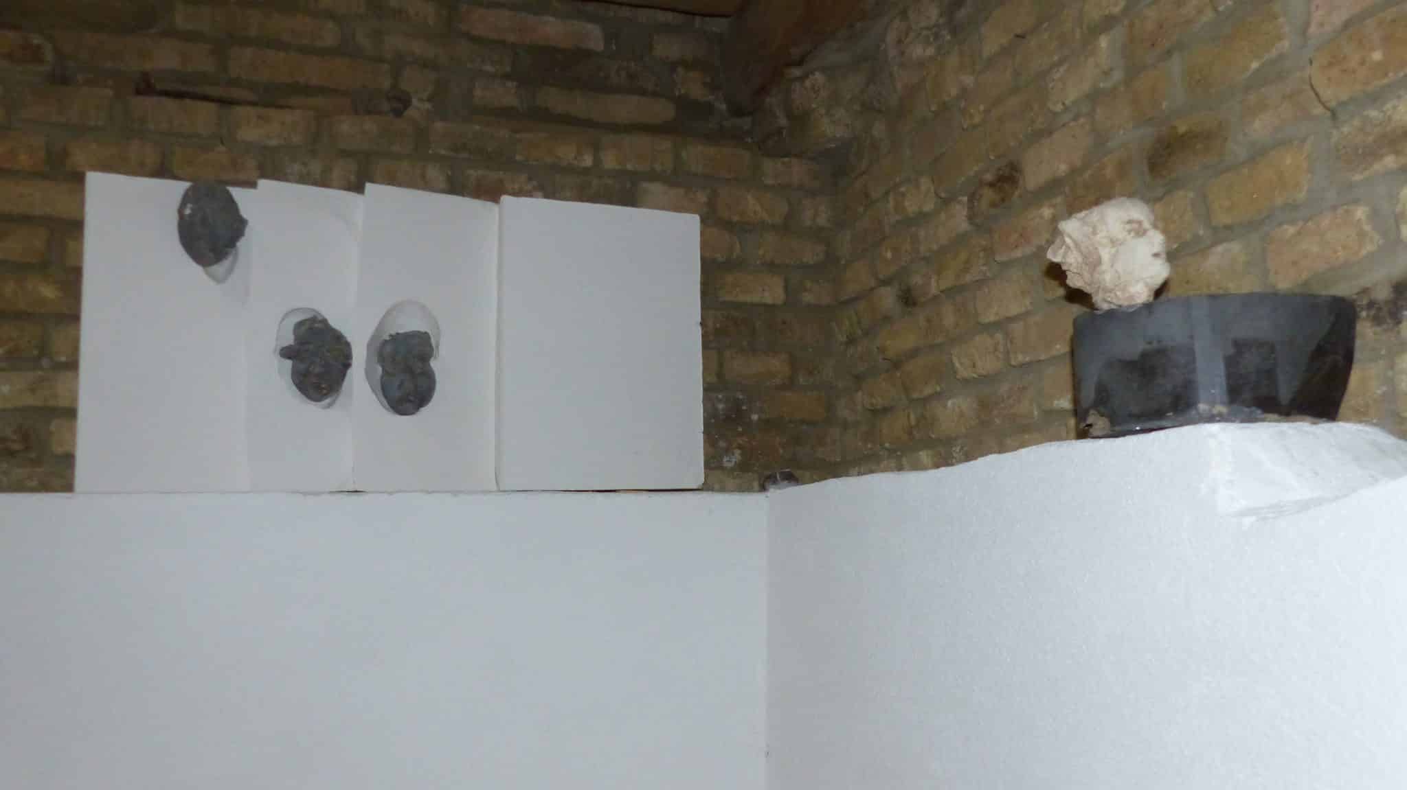 In Zöbing werden einige kleine Köpfe, eine Frauenbüste aber auch ein mittelgroßes Relief, bei dem verschiedene Köpfe aus unterschiedlichen Ebenen den Betrachtenden entgegenragen, präsentiert. In Engabrunn, wenige Kilometer entfernt, sind ähnliche Köpfe hoch oben im Kreuzrippengewölbe der dortigen Wehrkirche aus dem Beginn des 16. Jahrhundert angebracht. „Ganz ohne System und ohne, dass es darüber irgendwelche Unterlagen gibt“, klärt Hartmann auf, der dieses Kuriosum erst einen Tag nach Ausstellungsbeginn besichtigte das er zuvor nicht kannte. Es ist ein Beweis, wie stark sein Schaffen mit historischem Material aufgeladen ist, auch wenn er selbst dieses spezielle gar nicht kannte.