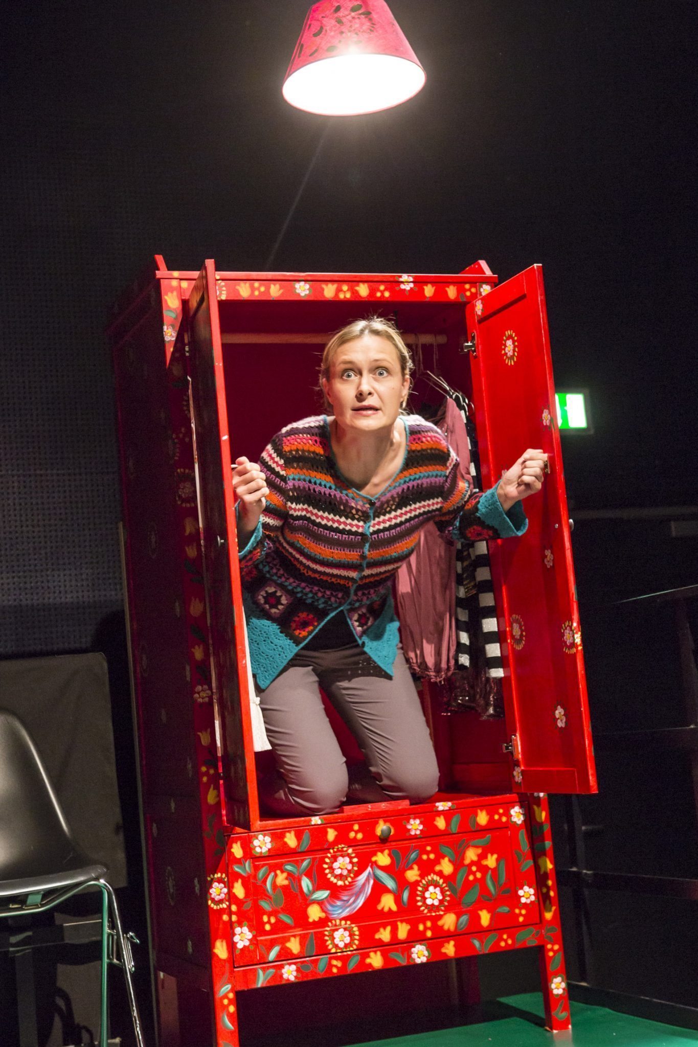 Die Stube für die Stubenoper – rote Holzmöbel mit buntem Blümchenstreumuster darauf – stammt von Claudia Vallant. Mit ihrem Schürzenkleid, ihren groben Schuhen und Socken passt nur die Bäuerin selbst in die Umgebung und markiert damit eine untergehende Welt, die sich trotz aller ersehnter Veränderung so nicht mehr halten kann.