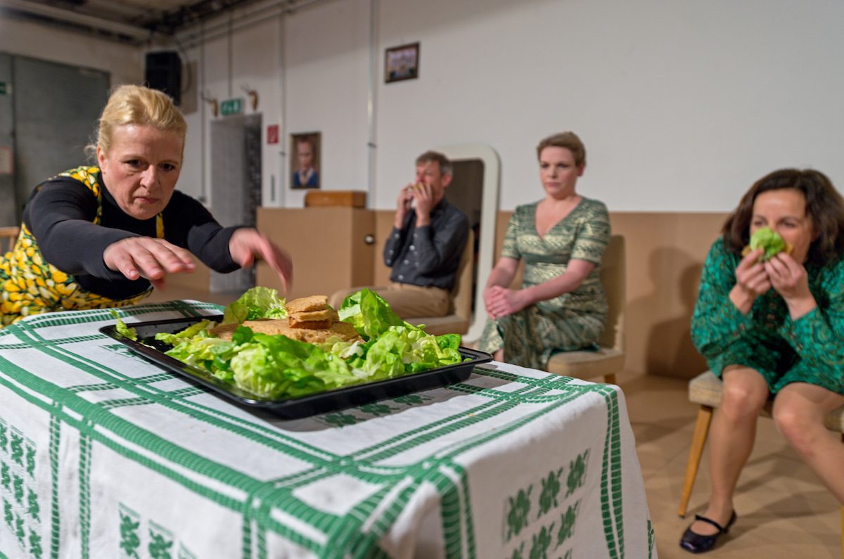 Es ist nicht die humpelnde Geschichte, die an diesem Abend fesselt. Vielmehr lässt sie viele Fragen offen. Es ist auch nicht eine geschliffene, psychologisch nachvollziehbare Figurenführung, mit der Ed. Hauswirth beeindruckt. Im Gegenteil, einige Wendungen bleiben psychologisch gesehen unerklärlich. Vielmehr sind es zum Teil relativ seichte Gags – wie in jener Szene, in welcher alle mit vollem Mund, in den sie sich ein „Weizer Weidelamm“ stopfen – ihre philosophischen Ergüsse über die Biolandwirtschaft und die Verwerflichkeit von Dönerfleisch zum Besten geben. Zum Glück mit Übertitelung, die das Gesagte wenigstens so erklärbar macht. Auch scheint es vorauseilender Humorsgehorsam zu sein, der das Publikum gleich zu Beginn bei der Vorstellung der Frauen lachen lässt, die an sich noch nicht wirklich humorig ist.