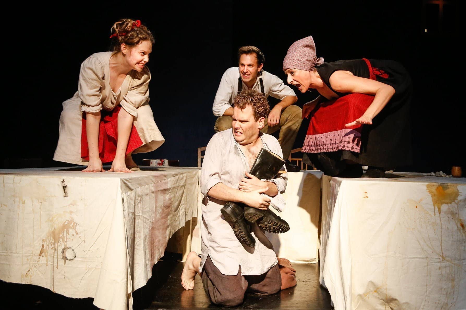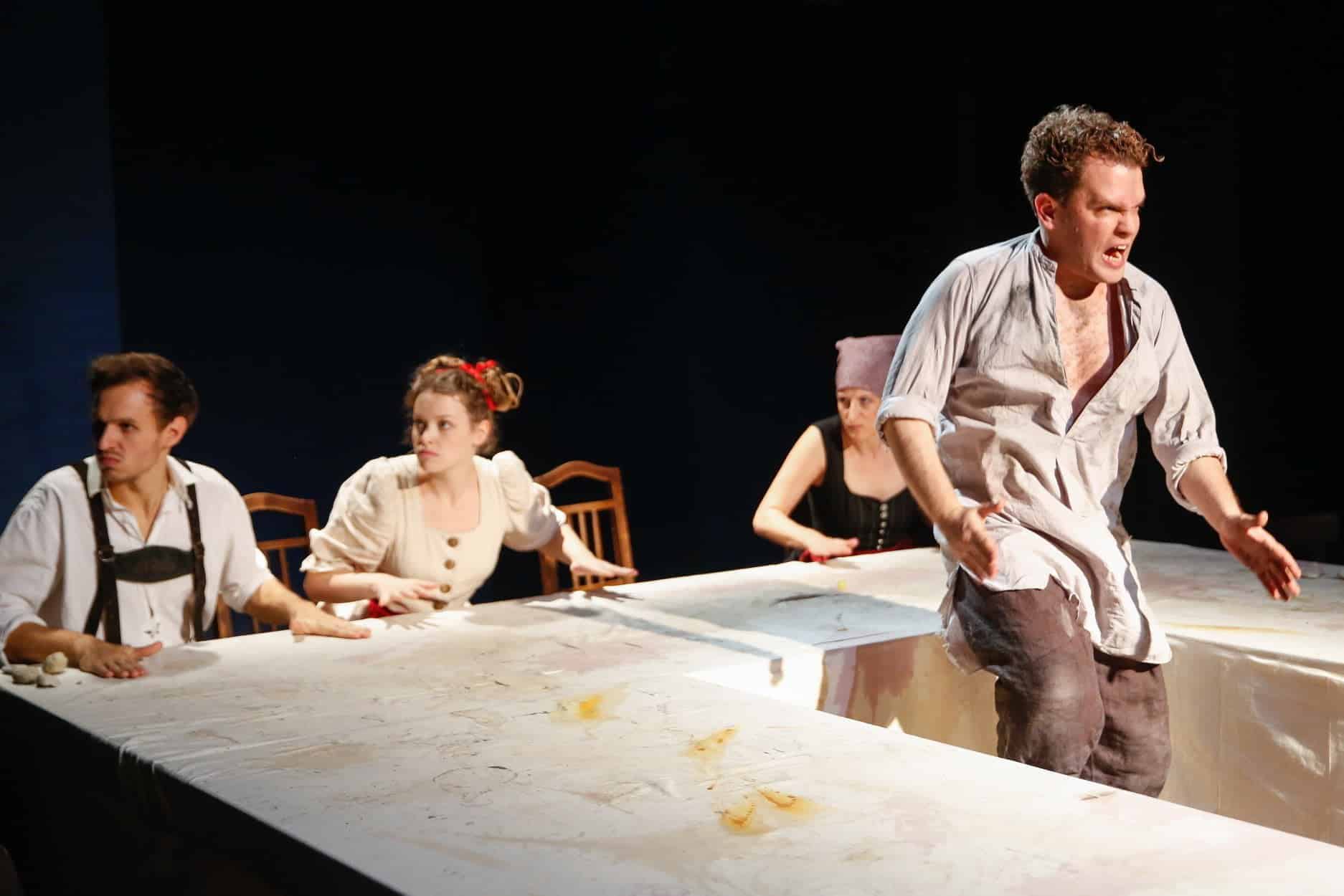 Das Bühnenbild besteht aus nicht viel mehr als einem großen Tisch mit weißem Tischtuch, unter dem Pavel immer wieder Zuflucht findet. Das Kloster wird in Form eines beleuchteten Fensters hoch über der Bühne angedeutet. Der rasche Szenenwechsel und auch der häufige Kostümwechsel des Ensembles, gehen mit eine hohen Erzähltempo einher.