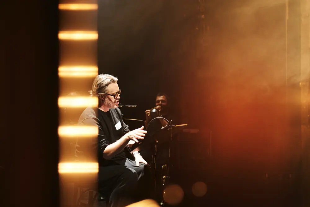 Mittig auf einem Stuhl platziert – keinem Ohrensessel wie jenem, den Bernhard als seinen Beobachterposten im Stück häufig zitiert – hinter ihm die 10-köpfige Musicbanda Franui im Halbkreis angeordnet, las Ofczarek Bernhards Sozialbeobachtung feinst abgestimmt mit den Musizierenden.