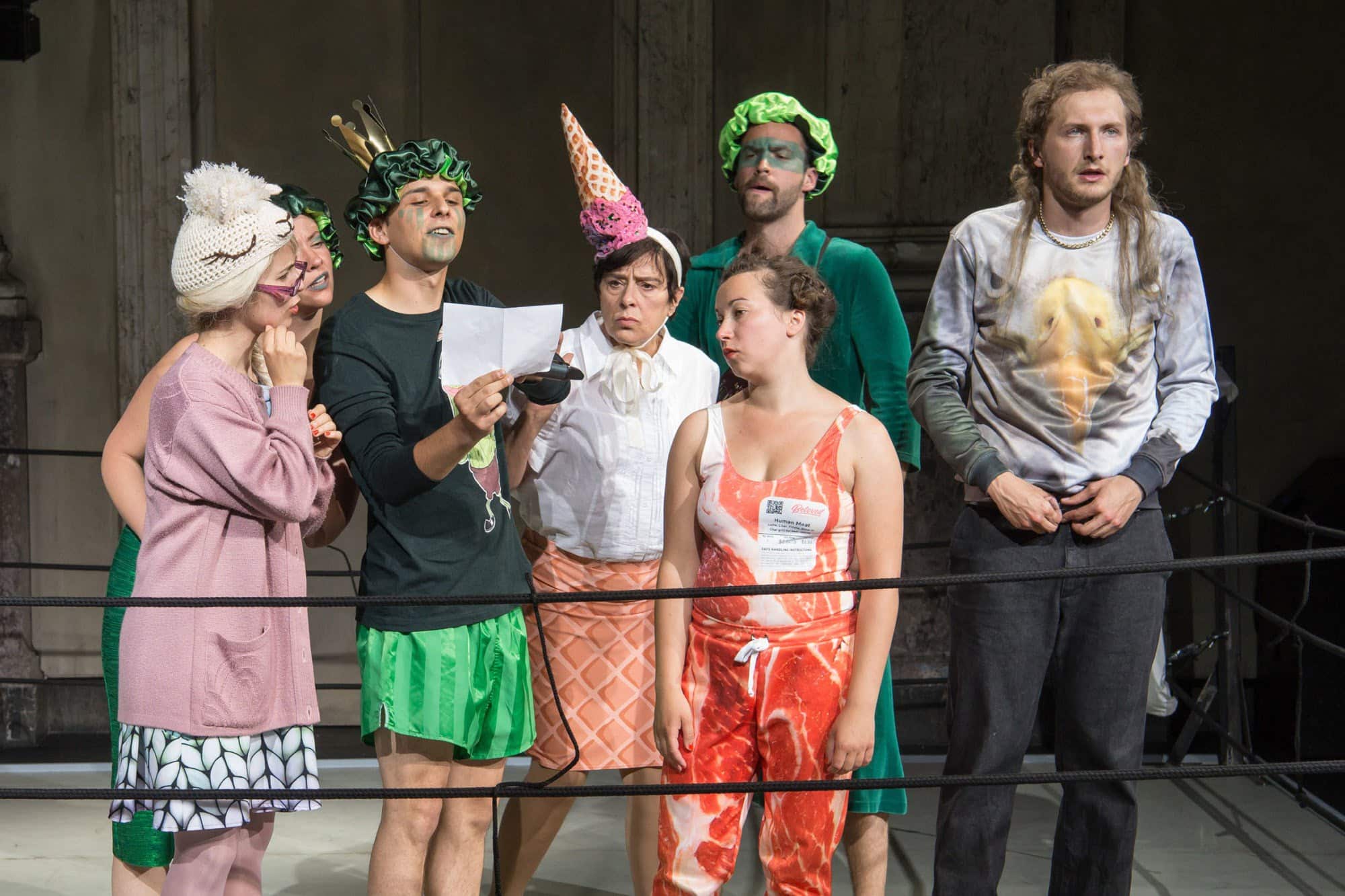 Bei einer Regisseur-Persiflage, höchst humorig von Lukas Weiss interpretiert, muss sich die bedrohliche, letztlich aber besiegte Schlange brav in das Eck eines Boxringes verkriechen und dort auf Kommando sterben. (Bühne Claudia Vallant) Der philosophische Exkurs, den der Regisseur während des Verzehrs eines picksüßen Punschkapferls in den derzeitigen Regierungsfarben – außen türkis und innen braun – von sich gibt, endet mit der weisen Aussage: „Es gibt viele miteinander konkurrierende Wahrheiten, das kann nicht jeder ertragen. Das ist die Wahrheit!“