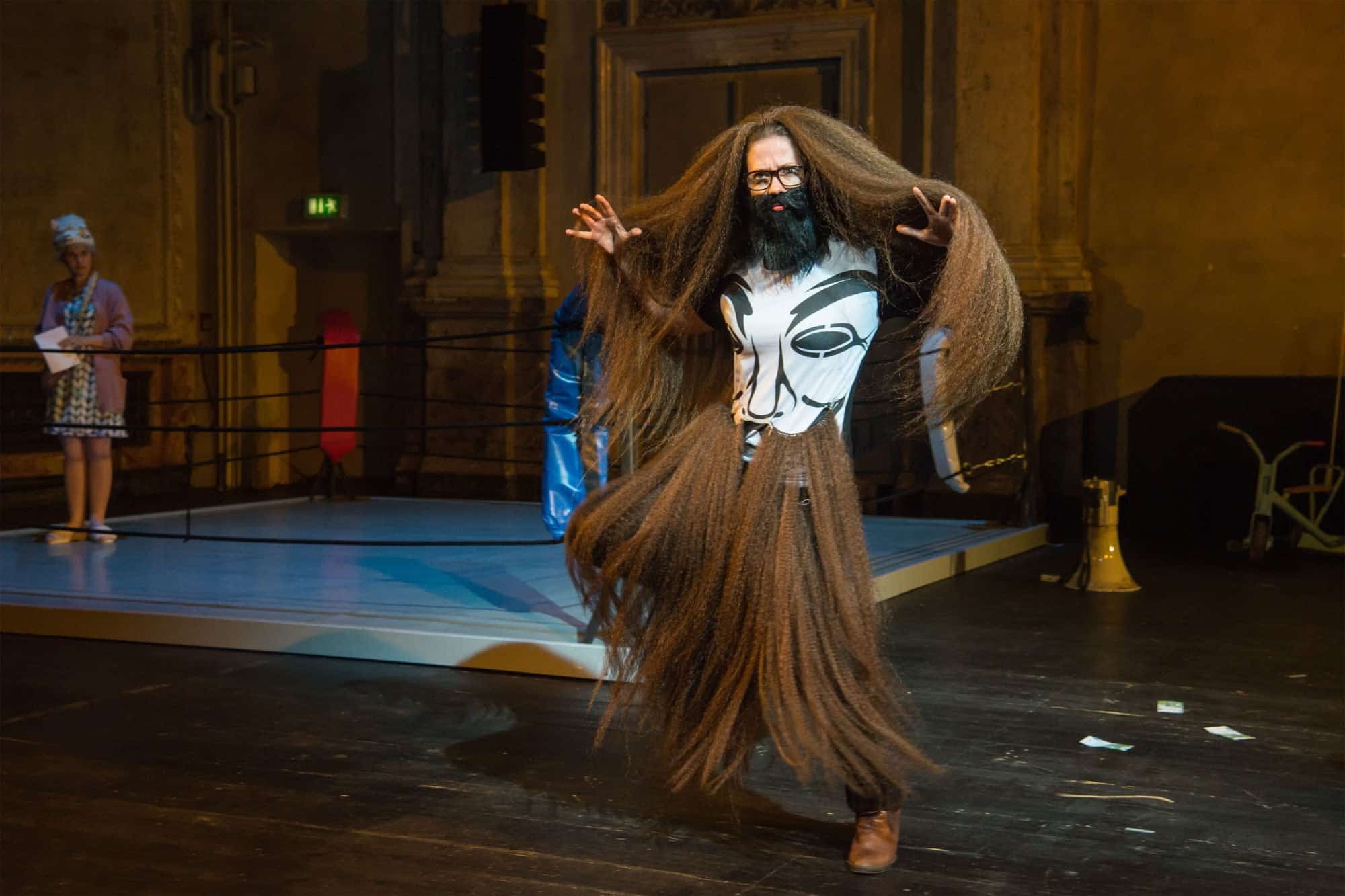 Wenn Bakunin gleich mit zwei Rauschebärten und Langhaarmähne auf die Bühne kommt und während seines Interviews sein „Nachfahre im Geist“, Slavoj Zizek, via Einspielung parallel zu hören ist, wenn sich der ehemalige, deutsche Arbeitgeberpräsident Dieter Hundt (Constanze Winkler) am Ende einer Debatte auf alle Viere begibt und sein Bein zum Pinkeln hebt, wenn Mr. Trump und Kim-Jong-Un auf T-Shirts ihre Konterfeis vor sich hertragen und gemeinsam einem Nonsens-Chor aufstellen, dann macht die Regisseurin deutlich, dass sie dem ohnehin schon bewusst schrägen Text noch eine gehörige Portion Theaterwahn hinzufügt. (Kostüme Anna Luisa Vieregge)