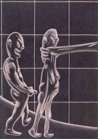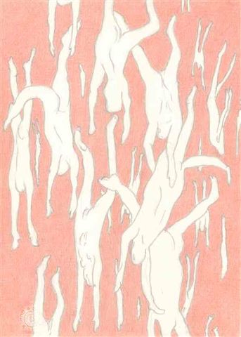Mit Blättern aus der Serie „Foul rain“ wird er einem vordergründigen Ästhetizismus gerecht, der sich beim zweiten Hinsehen eher in Grauen verwandelt. Denn das in helles Rot eingebettete Muster entpuppt sich samt und sonders als kopfüber stürzende Menschenleiber. Der „foul rain“ – der widerliche Regen lässt Gedanken zu Massenvernichtungen in jede Richtung zu, kann aber genauso gut als artifizielle Fingerübung gelesen werden, in der Eerden versucht, ein Thema mit Abwandlungen durchzuspielen.