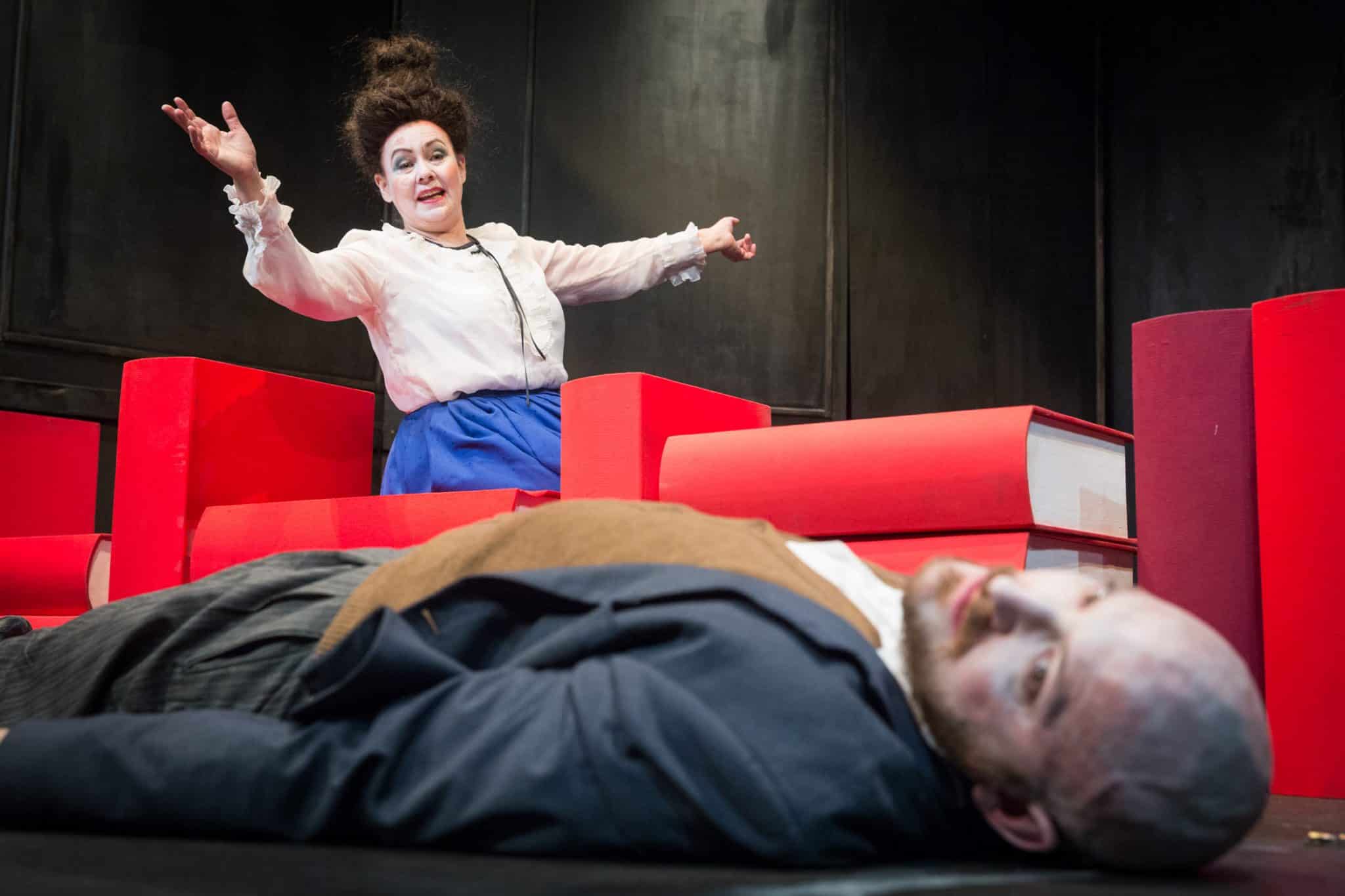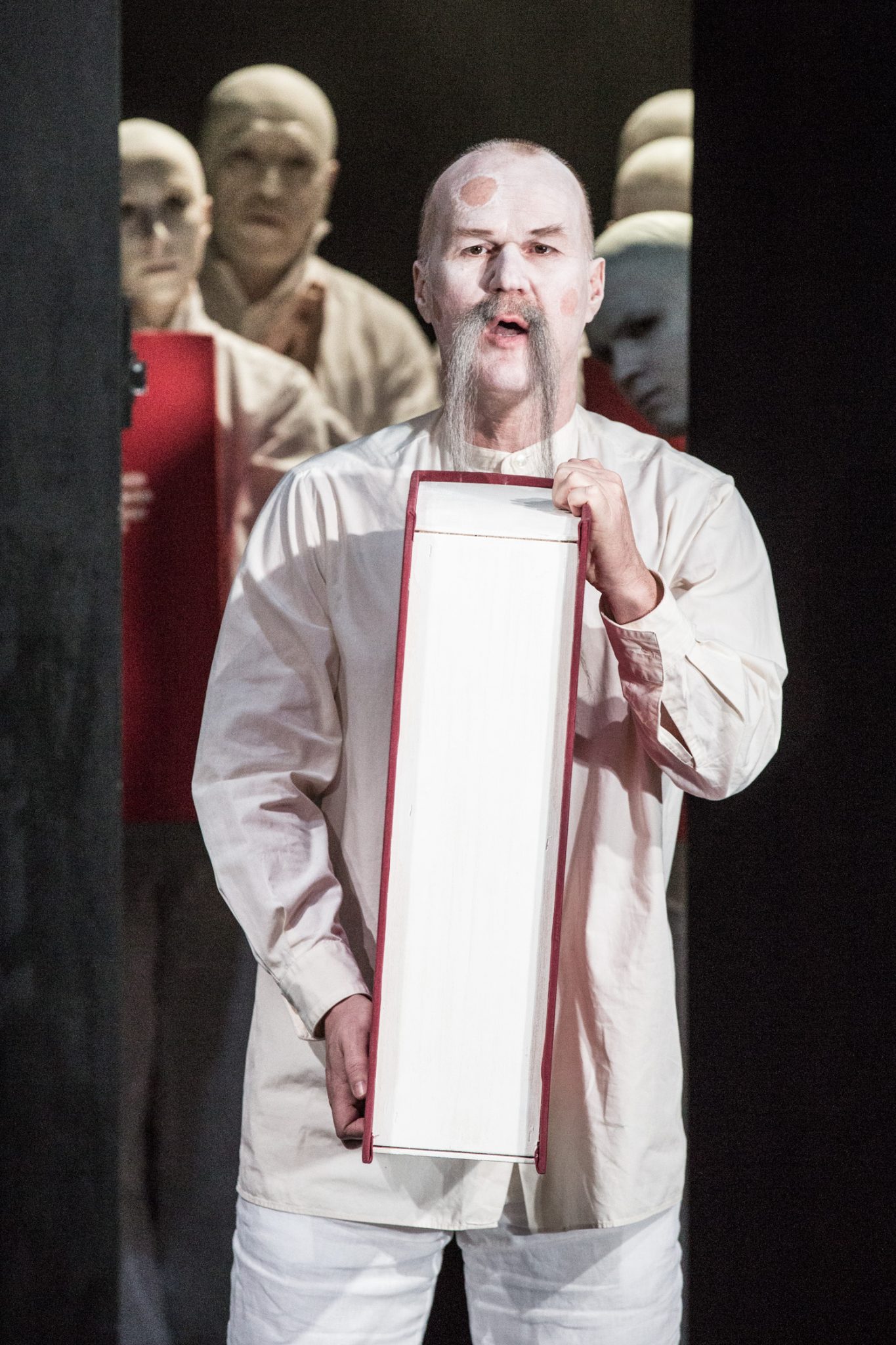 In einem bedrückenden Bühnenbild von Alexandra Burgstaller, die einen großen, mit dunkelbraunem Holz vertäfelten Raum wiedergibt, in dem sich riesige, grellrote Folianten befinden, agieren Alexander Braunshör als Hauptfigur Kien sowie Petra Strasser als Hausgehilfin und seine spätere Frau. Die absurde Szenerie, die sich durch Verschieben der Wände in späteren Szenen als höchst wandelbar erweist, unterstreicht den ebenso absurden Charakter der Figuren aus dem Roman.