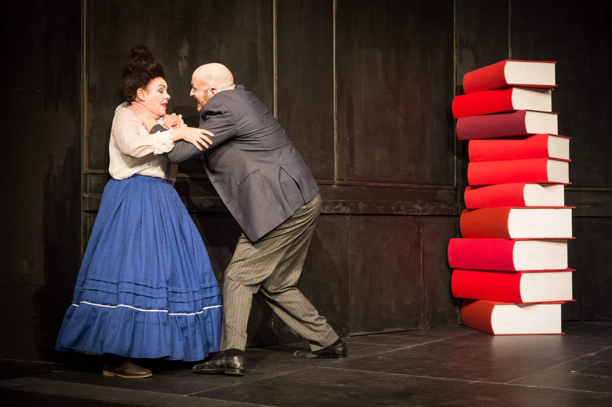 Die ungeheuren Verwicklungen des Geschehens kommen dadurch zustande, dass Kien und seine Frau eine gänzlich andere Sprache sprechen. Kien ist von der Idee getrieben, der Menschheit als größter Sinologe seiner Zeit, wie er sich selbst bezeichnet, eine außergewöhnliche Bibliothek zu hinterlassen und verliert ob dieser Beschäftigung jeglichen Realitätsbezug. Er geht sogar so weit, Menschen, die ihre Bücher in einer Pfandleihanstalt versetzen wollen, Geld zu geben, damit die Bücher nicht einer solchen Schmach ausgesetzt werden. Wunderbar, wie Braunshör, im Aussehen beinahe Nosferatu-gleich, sich seine Ehefrau mit größtem Despotismus vom Leib hält und im Handumdrehen einem Schwindler auf den Leim geht, dessen Tun mehr als durchsichtig ist. Herrlich, wie Petra Strasser in ihrem blauen Bauschrock durchtrieben ihren Mann betrügen und sein Geld an sich reißen will. Ihre stereotypen Antworten kann man schon nach wenigen Auftritten mitsprechen und sich köstlich dabei unterhalten.