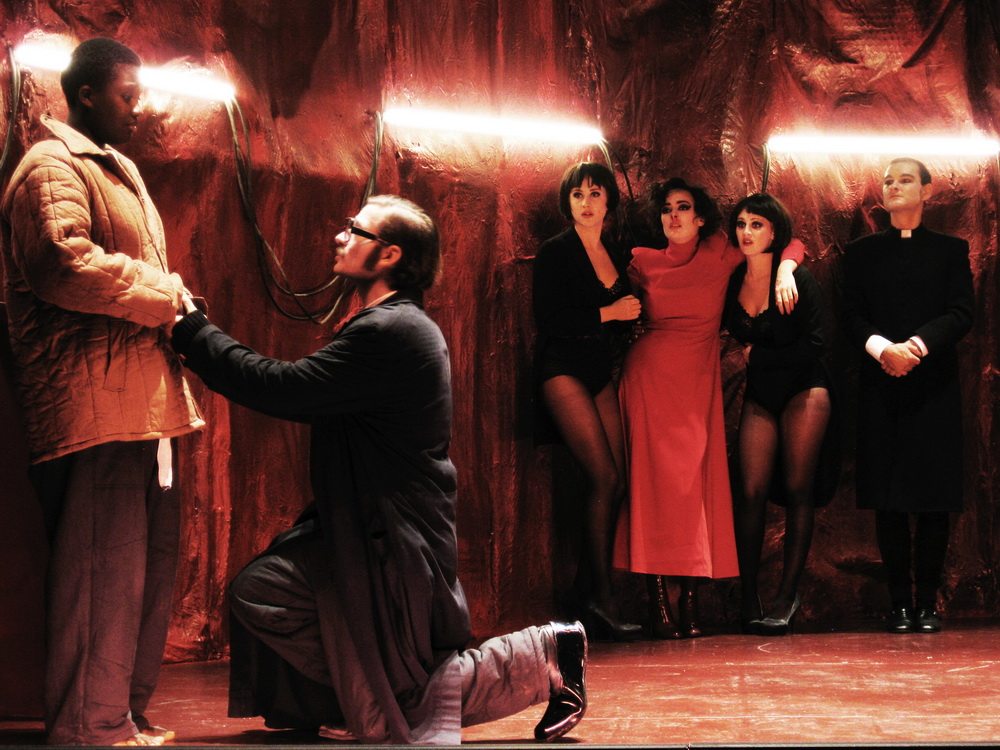 Eigentlich könnte sich Agafja (Mercy Dorcas Otieno) den Zukünftigen aussuchen, denn es steht 1:4 für sie. Ihr Pech ist nur, dass sie von der Männerwelt nicht sonderlich attraktiv gehalten wird. Alle Beteiligten nehmen für ihre Suche die Hilfe der Kupplerin Fjokla (Pauline Fusban) in Anspruch. Titov lässt sein Ensemble an einem Ort spielen, der wie der Vorhof zur Hölle erscheint (Bühnenbild Nathalie Lutz). Rote Wände, die an grob behauene Felsen erinnern und kahle Neonleuchten lassen keine Wohlfühlstimmung aufkommen.