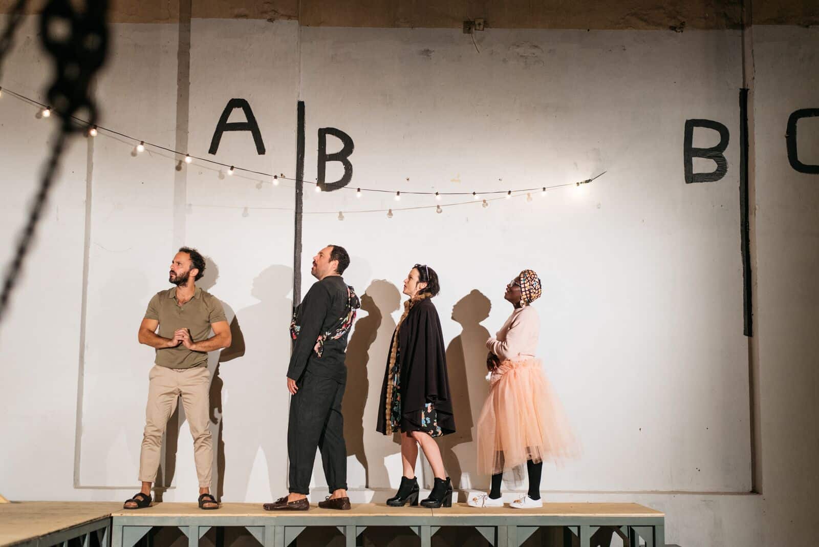 Neu dazu kam der Anbau einer Holztreppe und ein kleiner Catwalk mit einem Vorplatz, auf dem sich die Freunde während der Aufführung häufig treffen. (Bühne und Kostüme Johannes Weckl) Marc und Nana, ein unverheiratetes Paar, Marcs Tochter Anja und Joy, eine Freundin von Nana (Veronika Glatzner in Hochform), sowie Sebastian finden sich ein, um ein Wochenende abseits vom städtischem Trubel und Arbeitszwang zu erleben.