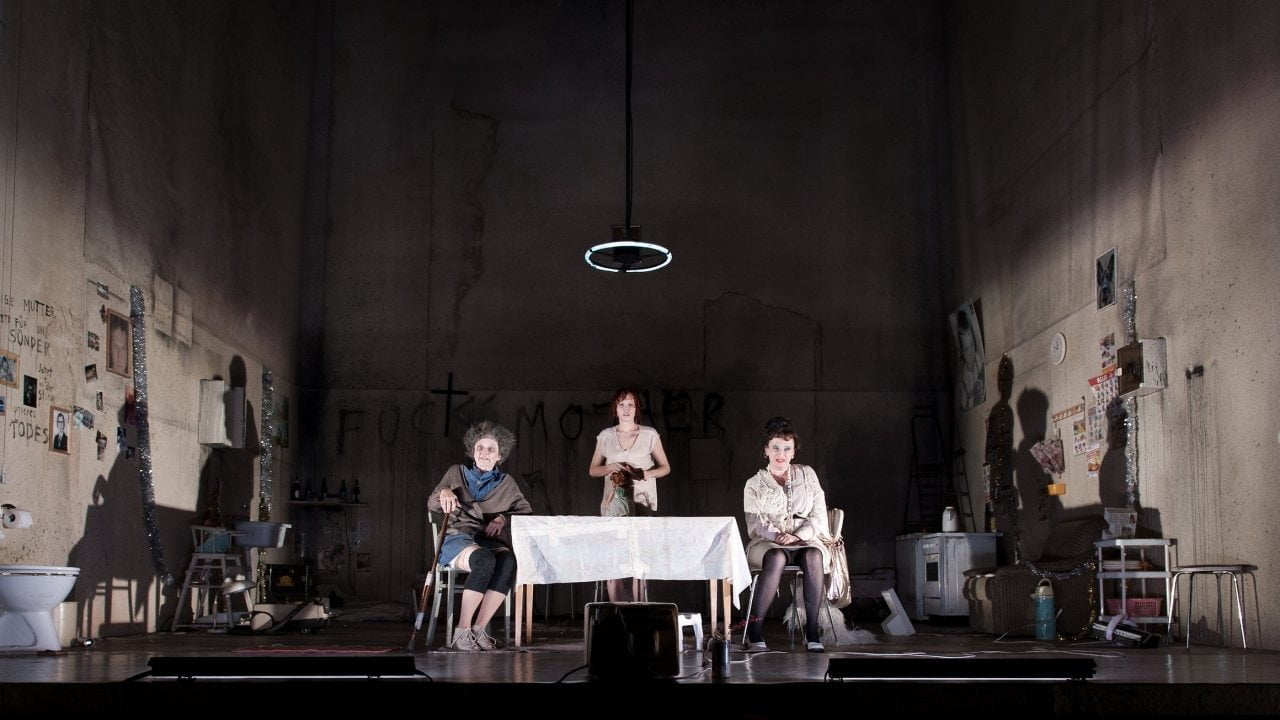 Gänzlich anders als in der Inszenierung von Miloš Lolić im Volkstheater in der vergangenen Saison setzt Bösch nicht auf Abstraktion, sondern auf harten Anschauungsunterricht in Sachen Milieustudie einer durch Verdrängung, Verzicht und Schuld höchst gefährdeten Dreiergemeinschaft. Die Bühne selbst mutiert zum kleinen Guckkasten im großen Bühnenraum des Akademietheaters. Schäbig, mit einer Reihe von Arme-Leute-Requisiten ausgestattet, prangt an der Stirnseite in Riesenlettern die Aufschrift Fuck you mother – in deren Mitte deutlich sichtbar ein Kreuz zu erkennen ist. Die Wut von Hermann auf seine Mutter wird in dieser kalten Umgebung beinahe greifbar. Das letzte Bild, das die abgeschlachtete Mariedl blutverschmiert auf dem Küchentisch zeigt, geizt nicht mit Dramatik. Während die drei noch ihr Herrgott-Lied singen, rinnt von der Wand weiter unaufhörlich Blut.