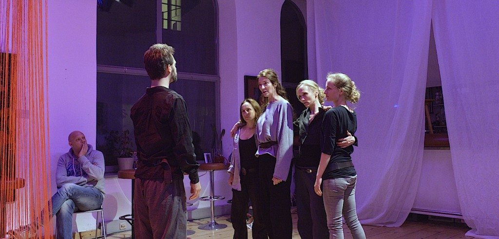 Schscht, still, Achtung! Das Publikum lenkt seine Aufmerksamkeit weg von der Bühnenmitte, die dieses Mal im großen Raum im Erdgeschoß angelegt ist, hin zur Treppe, die im Brick5 in den ersten Stock führt. Vier Frauen schleichen sich von dort herunter, zischen sich gegenseitig an und landen schließlich mitten unter den Zuschauerinnen und Zuschauern. Sie blicken reihum und finden nach und nach in die Geschichte. Oder sind sie dort schon von Anfang an? Béla Bufe inszenierte unter dem Label der Schlüterwerke sein erstes Bühnenstück. „Nowhere Man“ ist es betitelt, wie der bekannte Beatles-Hit aus dem Jahr 1965. Später wird er auch tatsächlich angestimmt und so lange vorgetragen, bis er sich in einer Kakophonie verläuft. Der Songtext könnte programmatisch für all jene stehen, die sich dem Vergnügen von Computerspielen hingeben. „He´s a real nowhere man sitting in his nowhereland making all his nowhereplans for nobody“.