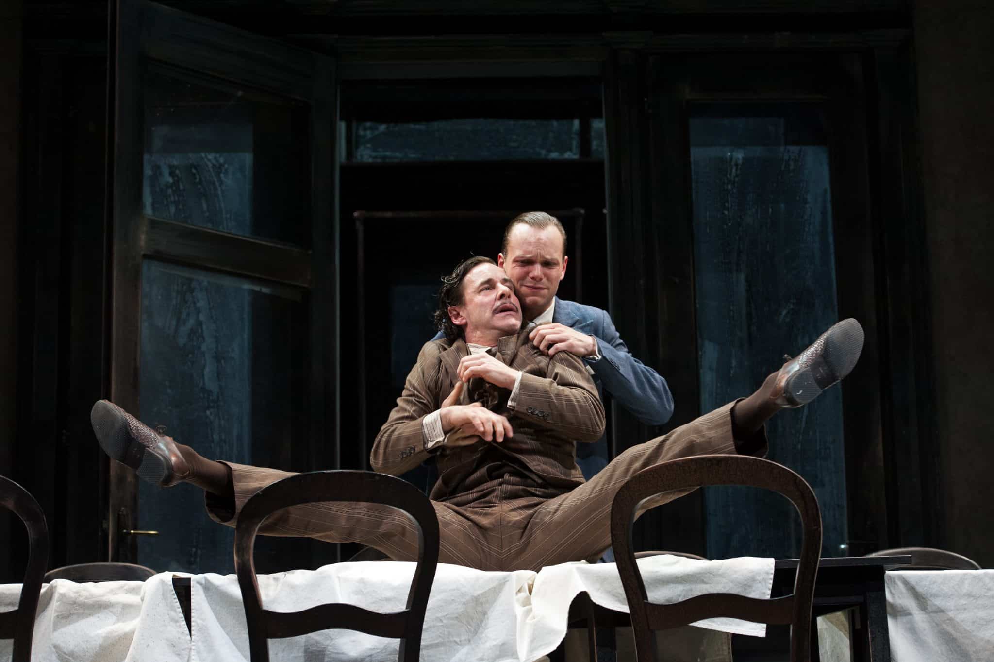 Es wird gestritten, gekämpft und gegessen. Es werden Schuldwechsel zerrissen und Eheverträge gebrochen. Noble Herren erweisen sich als Wendehälse, Eheanwärter als Frauen und das Dienstpersonal hat entweder nicht einmal genug Geld um zu essen, oder steckt so tief in einer Abhängigkeit, dass ein selbstbestimmtes Leben nicht möglich ist. Carlo Goldonis Diener zweier Herren, das am Burgtheater Premiere hatte, war zuvor schon mit akklamierenden Kritiken in Recklinghausen zu Gast. Das Spiel um versprochene, verlorene und wieder gefundene Liebe wurde von Christian Stückl rasant inszeniert. Dass die Szenenwechsel in Windeseile vorgenommen werden können, ist dem Bühnenbild von Stefan Hageneier zu verdanken. Er zeigt zwei Speisesäle eines Restaurants, das schon einmal bessere Zeiten gesehen hat. Es könnte aber auch das Innere und der Gastgarten vor der Wirtschaft sein, was im Grunde aber egal ist – die Drehbühne, die sich häufig in Bewegung setzt, macht´s möglich, dass beide Räume auch zugleich sichtbar werden.