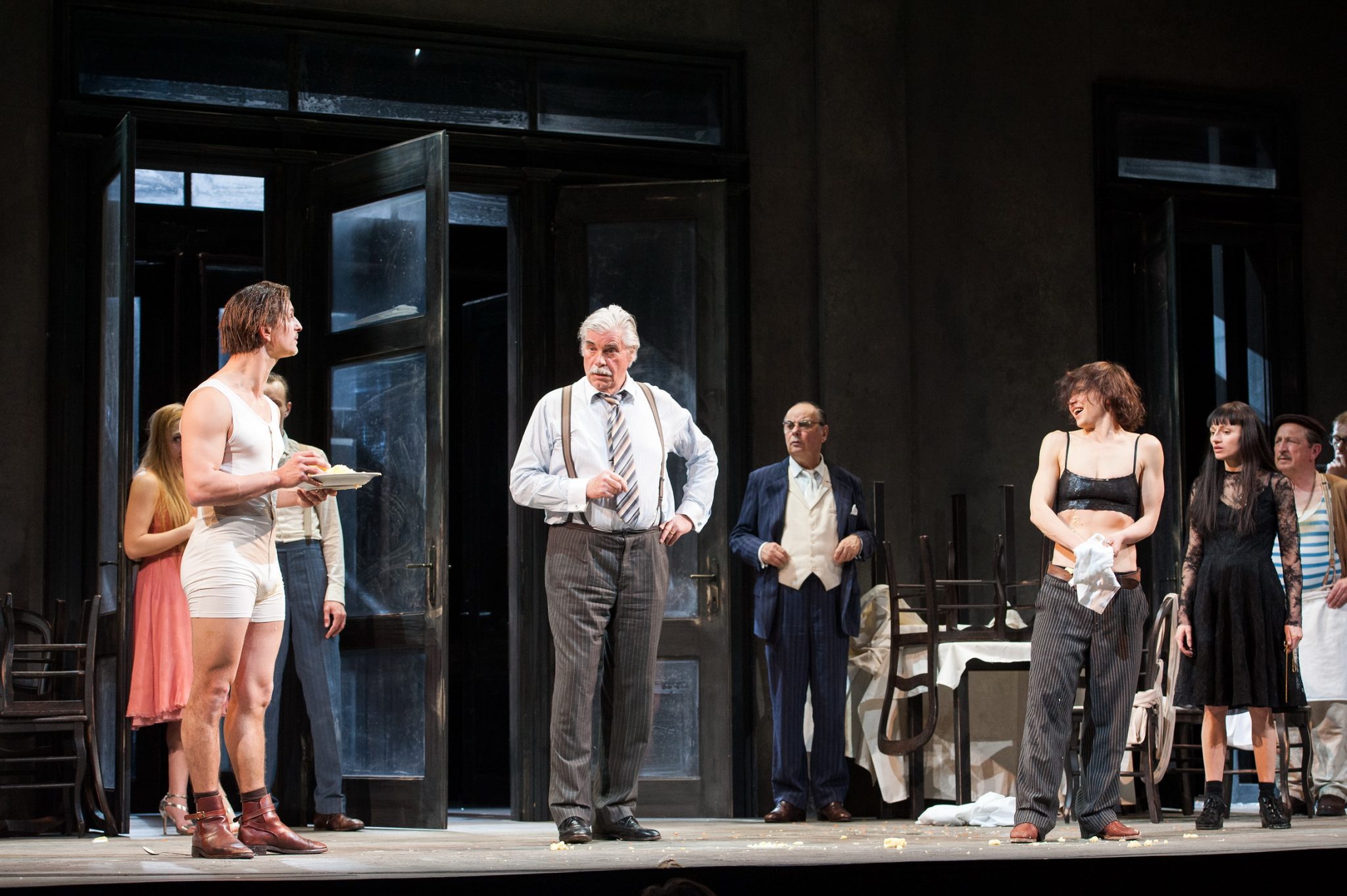 Irina Sulaver (Clarice), Sebastian Wendelin (Florindo), Christoph Radakovits (Silvio), Peter Simonischek (Pantalone deBisognosi), Johann Adam Oest (Dottore Lombardi), Andrea Wenzl (Beatrice), Mavie Hörbiger (Smeraldina), Hans Dieter Knebel (Brighella), Stefan Wieland (Ein Kellner) Diener zweier Herren (c) Reinhard Werner