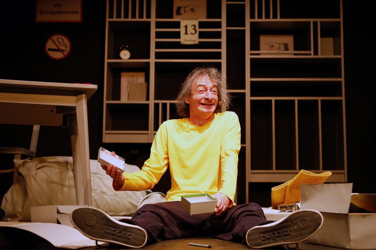 Dabei bedient er sich der ursprünglichsten Mitteln des Theaters und verwandelt die Bühne im Laufe des Stückes von einer Postdienstelle in eine Pirateninsel. Schachtel um Schachtel, die Rudi zuvor mehr oder weniger sorgsam als Postbote abstempelte, werden geleert und die darin befindlichen Objekte in sein Spiel und seine Verwandlung mit einbezogen. (Bühne und Kostüm Maria Theresia Bartl) Nicht nur, dass bei Rudi jeder Kalendertagabriss aufs Neue einen Freitag, den 13., zeigt: Der lähmenden Routine, der Rudi täglich ausgesetzt ist, folgt eine heillose Überforderung mit nervenden Anrufen am roten Telefon und immer rascher werdenden Postsack-Zulieferungen, bis diese schließlich eines Tages von einem Schlag auf den anderen ausbleiben.