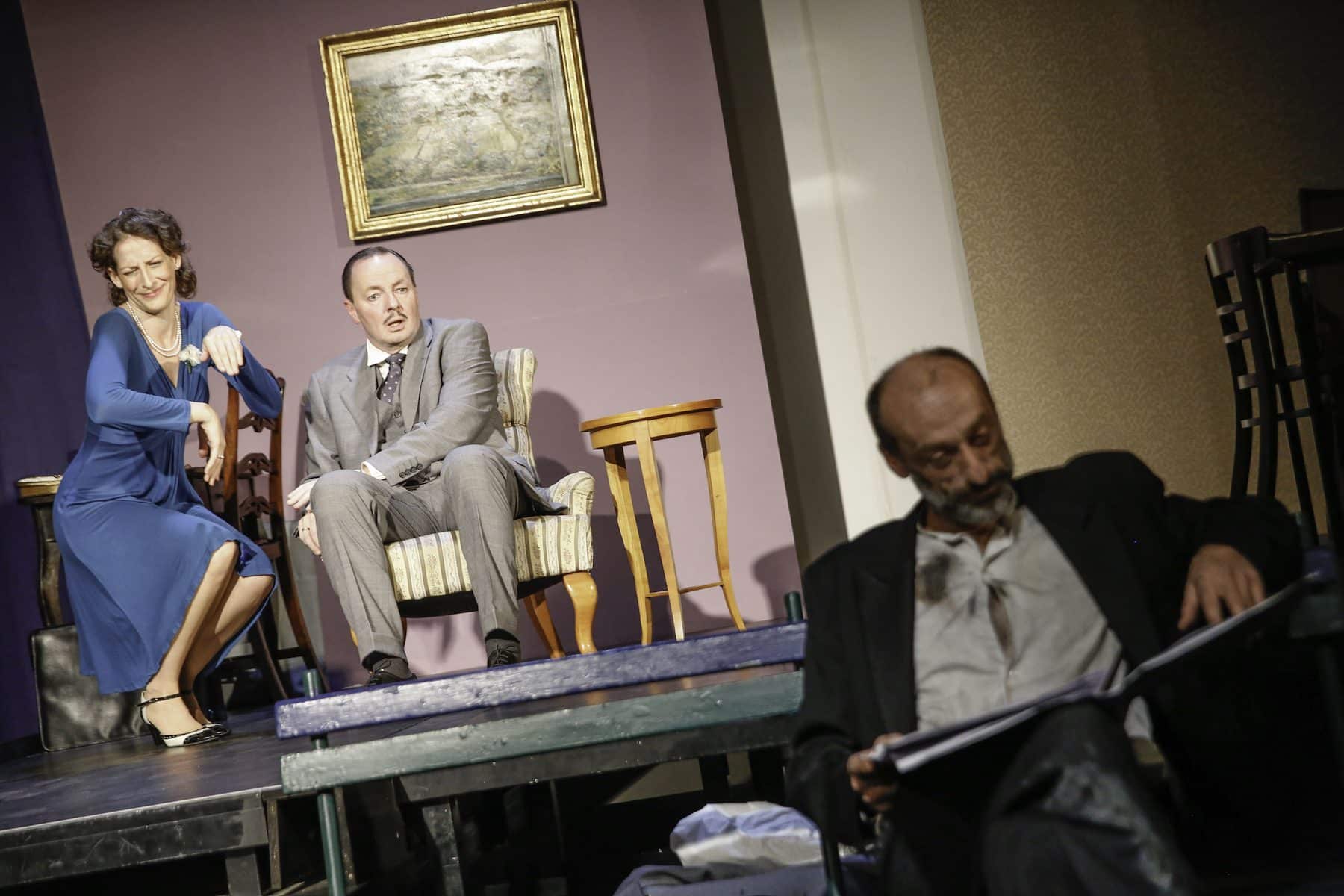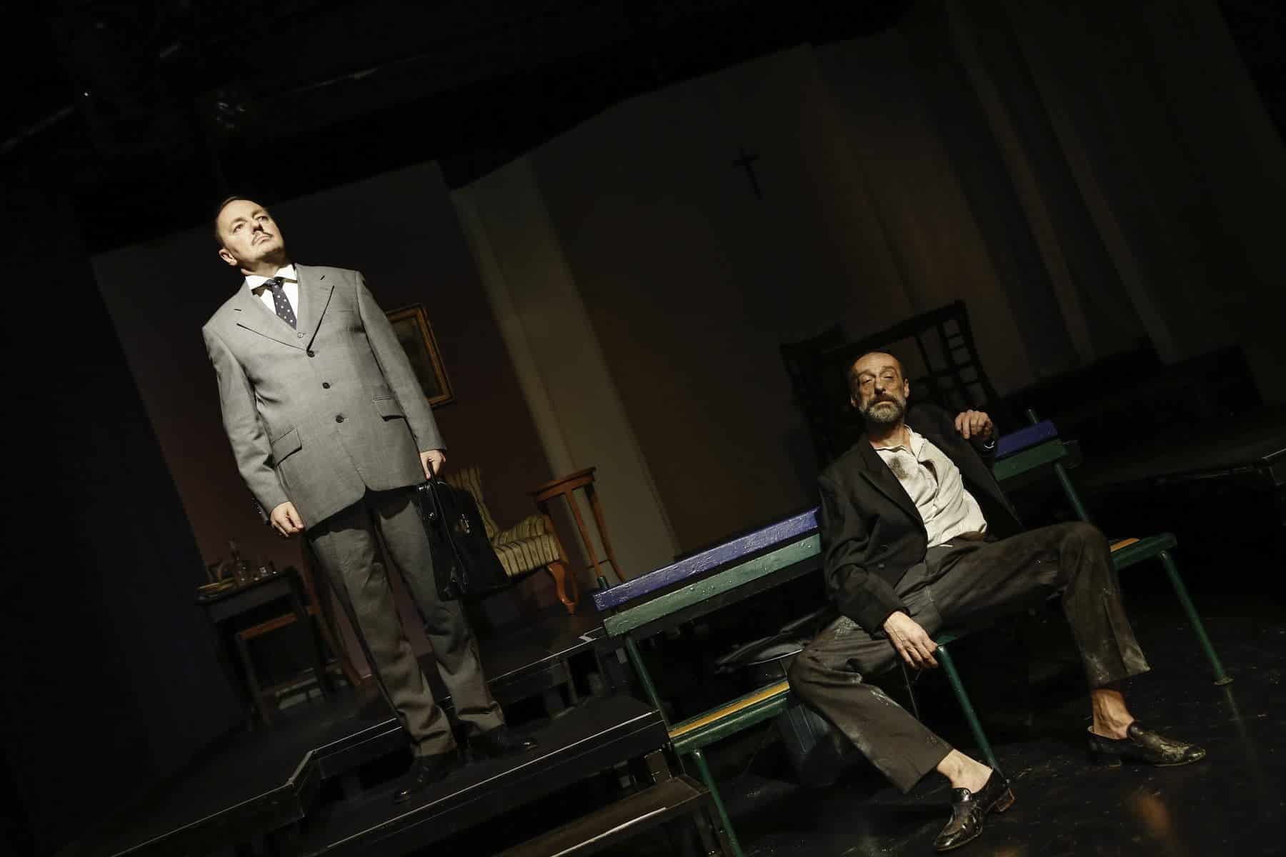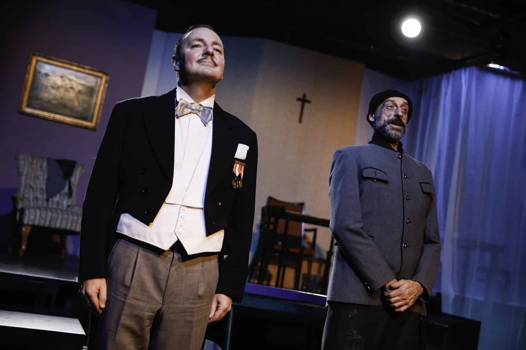 Tristan Jorde und Max G. Fischnaller geben den jungen und 50-jährigen Leonidas, der zuweilen auch gleichzeitig auf der Bühne steht. Damit gelingen Metzger sehr anschaulich jene Rückblenden, die Werfel in seiner Erzählung immer wieder anführt. Mit Robert Stuc kommt noch Leonidas verarmtes Alter-Ego hinzu, vor dem sich dieser wie der Teufel vorm Weihwasser fürchtet. Es ist genau diese Angst vor einem sozialen Abstieg, welche die Hauptfigur in dem Stück so agieren lässt, wie sie agiert.