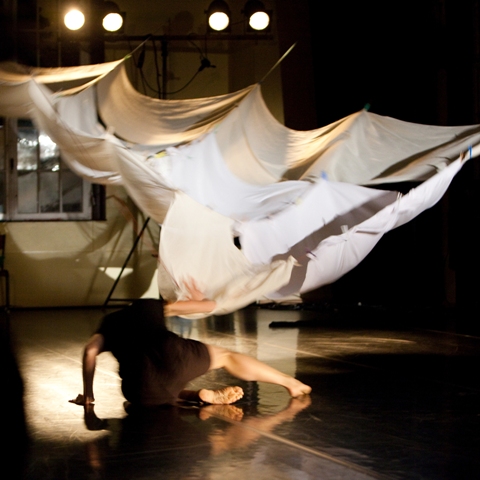 Ein großes, dreieckiges Segel überspannt beinahe die halbe Bühne. Unter ihm liegen drei Körper, die sich langsam rollend fortzubewegen beginnen. Ihre Bewegungen erinnern an jene, die man im Wasser macht, wenn man sich entspannt treiben lässt oder auch vorwärtskommen möchte. Nach langen, fast ewig währenden Momenten finden die drei Körper zueinander, verknäueln sich zu einem Wesen und lösen sich schließlich voneinander, um aus diesem imaginären Urmeer einzeln aufzutauchen. Begleitet war ihr Schwimmen nur von Atemgeräuschen, die wie von Ferne erklangen und den Eindruck des Unterwasserszenarios noch verstärkten. Aufgetaucht aus diesem schwere- und emotionslosen Zustand befinden sie sich staunend in dieser Welt, die von Beginn an mit Unbillen auf sie reagiert.