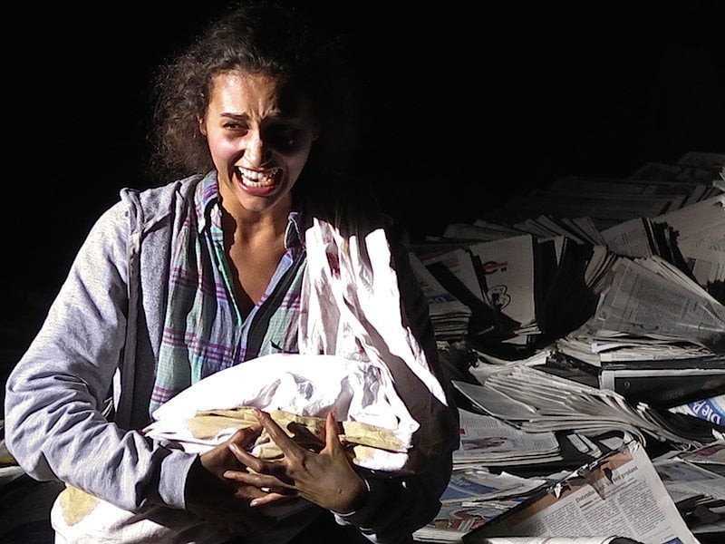 „Feuerseele“ stand in großem Kontrast zur Aufführung im Max Reinhardt-Seminar, eineinhalb Stunden später. Dort wagte sich David Stöhr, Studierender in der Regieklasse bei Anna Maria Krassnigg im zweiten Studienjahr an kein geringeres Stück als an das bei seiner Uraufführung heftig umstrittene Erstlingswerk der viel zu früh verstorbenen britischen Autorin Sarah Kane. „Zerbombt“ – eine schonungslose „homo homini lupo – Parabel“, lebt von Charakteren, die vom Krieg deformiert wurden. Kane erzählt die Geschichte des Journalisten Ian (Andrei Viorel Tacu) und seiner Freundin Cate (Michaela Saba Pircher). Die Geschichte einer kranken Beziehung, die längst aufgelöst wurde und dennoch kein Ende findet. Die Gewaltszenen, die Cate über sich ergehen lassen muss, wird sie zu einem späteren Zeitpunkt rächen, zuvor wird jedoch Ian selbst noch Opfer massiver Misshandlungen.