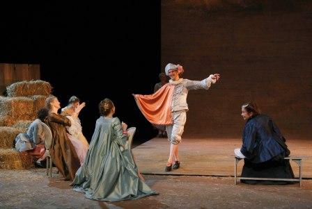 Soweit, so gut, möchte man meinen. Marivaux, der 1742 Mitglied der Académie francaise wurde und ab diesem Zeitpunkt kurioserweise seine bis dahin sprudelnde Schreibtätigkeit ziemlich versiegen ließ, schrieb eben eine geistreiche Komödie, die hauptsächlich vom Wortwitz und geschickten Schauspielern lebt. Punkt. Doch weit gefehlt. Der Autor entwickelte zwar tatsächlich ein lustiges und kurzweiliges Schauspiel, das ein rasantes Tempo aufweist. Zugleich jedoch ist dies ein zutiefst philosophisches Stück, nicht nur über Fiktion und Realität, sondern es gewährt den beiden Gegenspielerinnen, der bodenständigen Mme. Argante und der kunstsinnigen Mme. Hamelin, auch einen langen Dialog, der in pro und contra über die Sinnhaftigkeit, ja mehr noch, über die Legitimation des Theaters Auskunft gibt. Dieser Teil schiebt sich wie ein Fremdkörper in die rasche, locker-flockige Inszenierung, bei der Hähne schreien, Kühe muhen und Schafe blöken; bei der mit Heu geworfen wird und rotbäckige Äpfelchen quer über den Bühnenboden rollen. Dieser Stilbruch wird verständlich, wenn man bedenkt, dass in der Entstehungszeit des Stückes zwischen Rousseau und d´Alembert ein öffentlicher Briefwechsel im Gange war, quasi aus dem Hinterhalt zusätzlich von Diderot begleitet, in welchem es hauptsächlich um eine politische Debatte über die Kunst ging, wobei auch das Thema der Frauen angesprochen wurde. Marivaux` Komödie könnte man in diesem Zusammenhang als persönliches Statement zu dieser Debatte verstehen, welches die theoretische Auseinandersetzung eindrucksvoll und höchst vergnüglich auf die Theaterbretter verfrachtete.