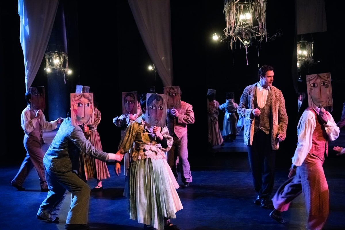 Ganz zu Beginn der über zweistündigen Aufführung wird durch ein Sturmbrausen eine Szene in einem Ballsaal eröffnet. An deren Ende erschießt sich coram publico ein Mann. Der raue Wind, der schon wenige Jahre nach der Oktoberrevolution für die Intellektuellen und Kunstschaffenden in Russland zu wehen begann, war ein existenzbedrohender. Das wird in der Produktion von Beginn an vermittelt. Das Tribunal, dem Achmatowa bald vorgestellt wird, besteht in der Inszenierung aus einer Horde überzeichneter männlicher und weiblicher Apparatschiks, denen die junge Frau hilflos ausgeliefert ist. Ihrer Inspiration verdankt sie schließlich ihr Überleben. Das Schwanken, die eigene Kreativität als Lebenselixier anzuerkennen, zugleich aber auch als jenes Element erkennen zu müssen, das der gleich geschalteten Gesellschaft im stalinistischen Russland immer wieder bedrohlich entgegentritt, bestimmt den Abend durchgehend.